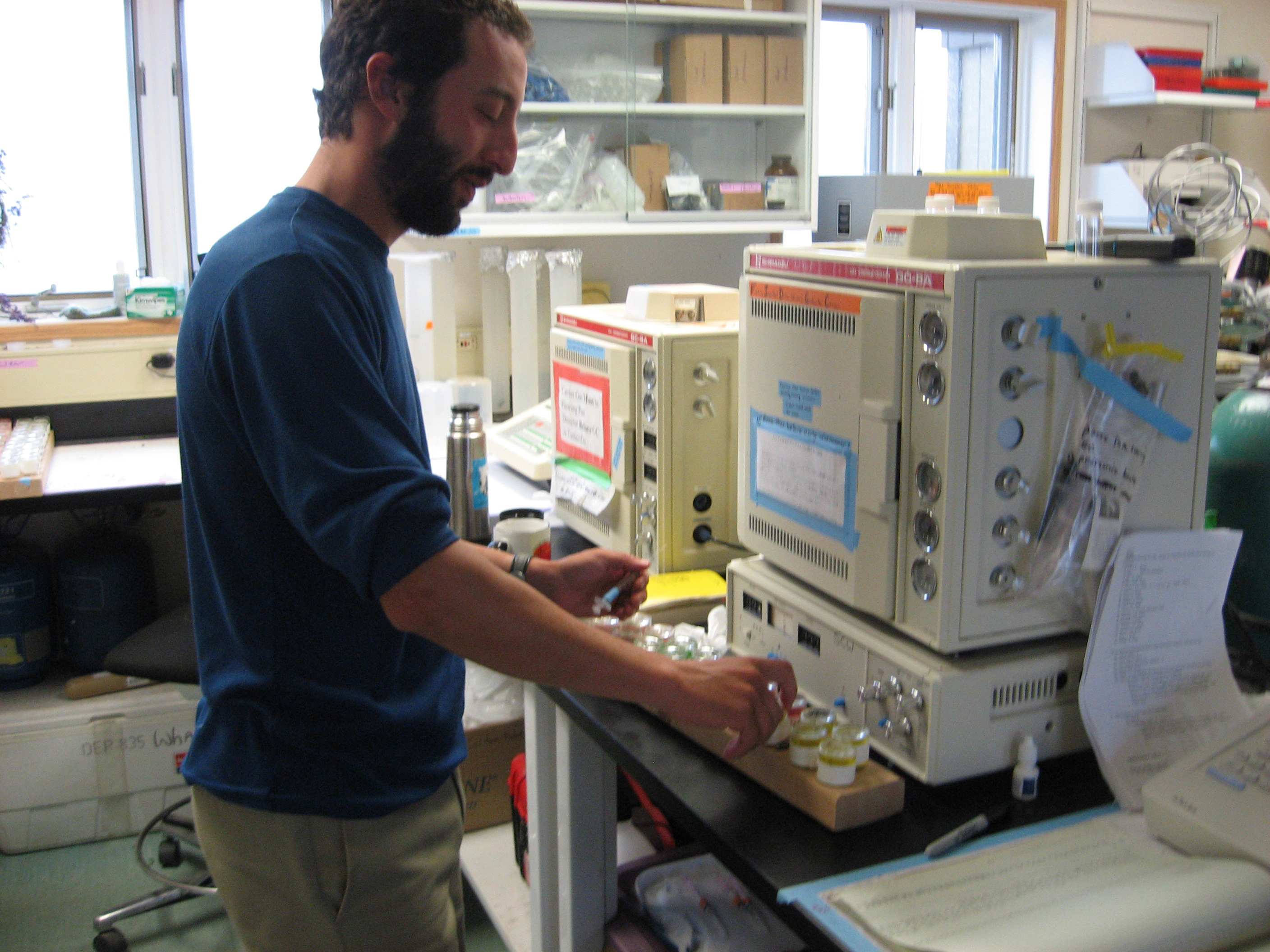Ken Fortino, a graduate student in Steve Whalen's lab at the University of North Carolina, prepares samples from lake sediments taken near Toolik Lake for gas chromatography analysis of levels of methane and other dissolved gasses.