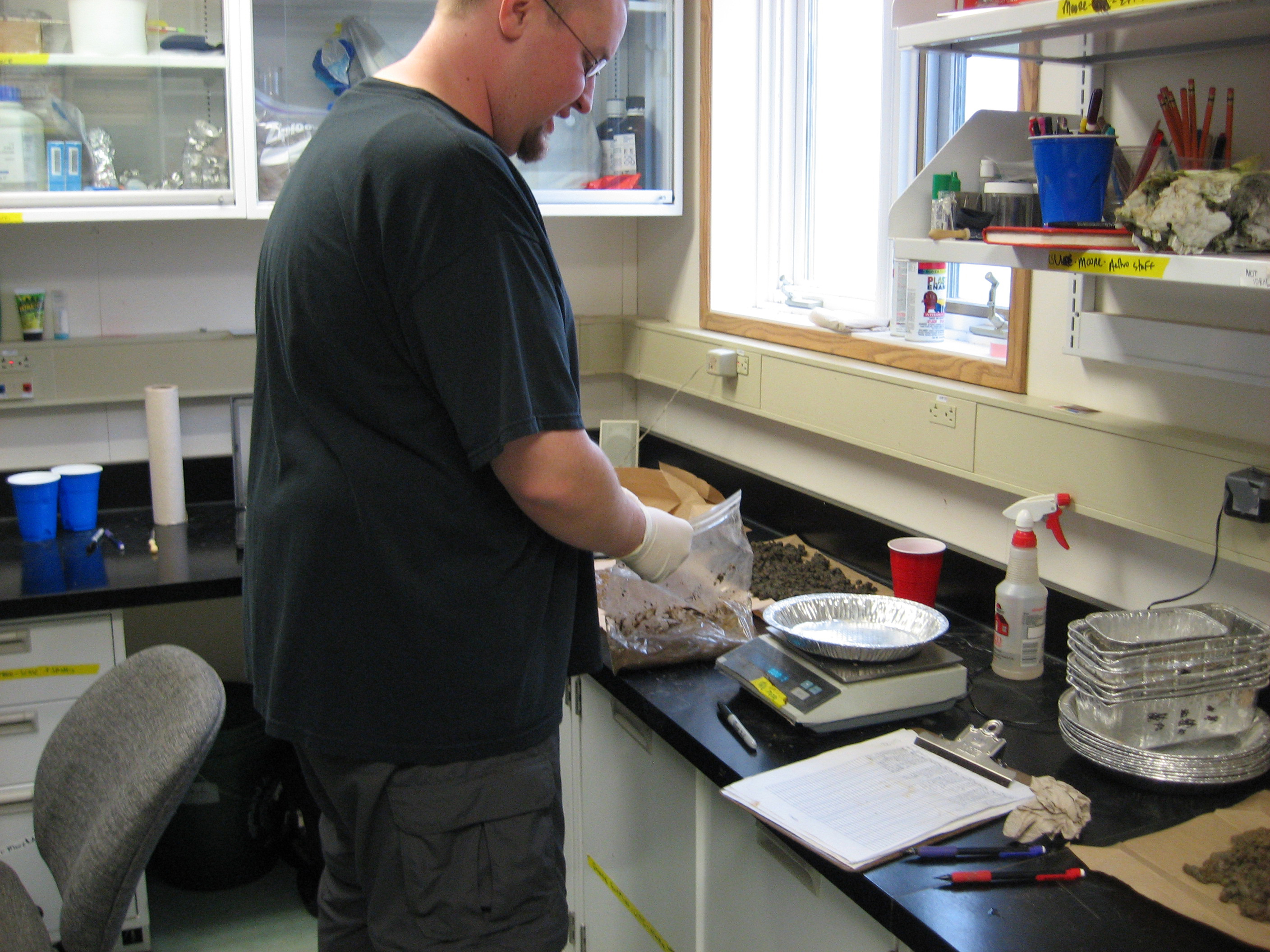 Greg Selby, a research associate in John Moore's lab at Colorado State University, weighs soil samples taken from the area near the Toolik Field Station before drying.