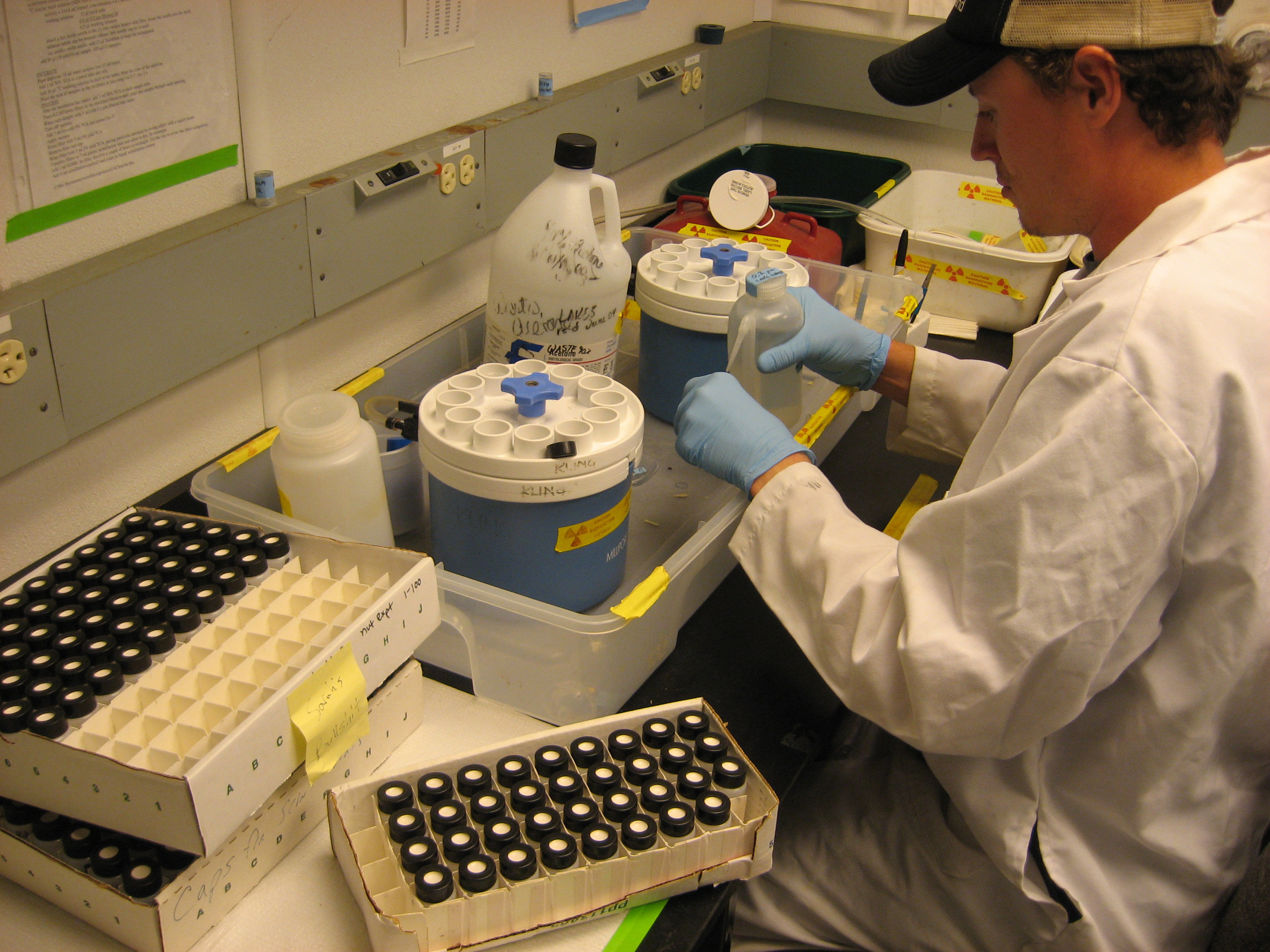 Alex Mettler, a research assistant in George Kling's lab at the University of Michigan, prepares water samples from the "I-series" lakes near Toolik Lake. The samples will be incubated with 14C-leucine to estimate bacterial production.