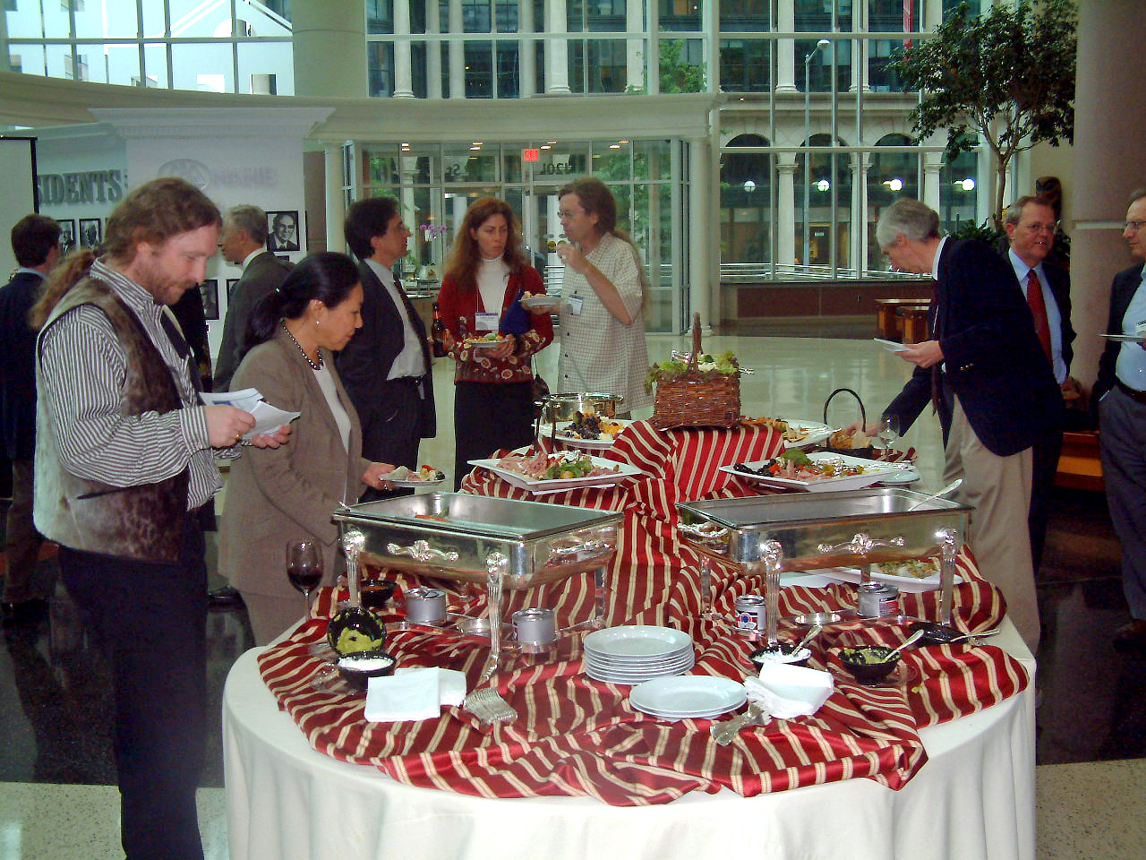 Participants fill their plates at the reception, which included a buffet and hosted bar and featured a poster session on arctic research and a special Greenlandic exhibition. Arctic Forum 2005.