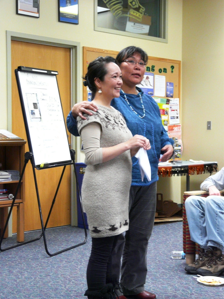 Aviâja Egede Lynge speaks to native students with Panigkak Agatha John-Shields at Native Student Services, at the University of Alaska Anchorage.
