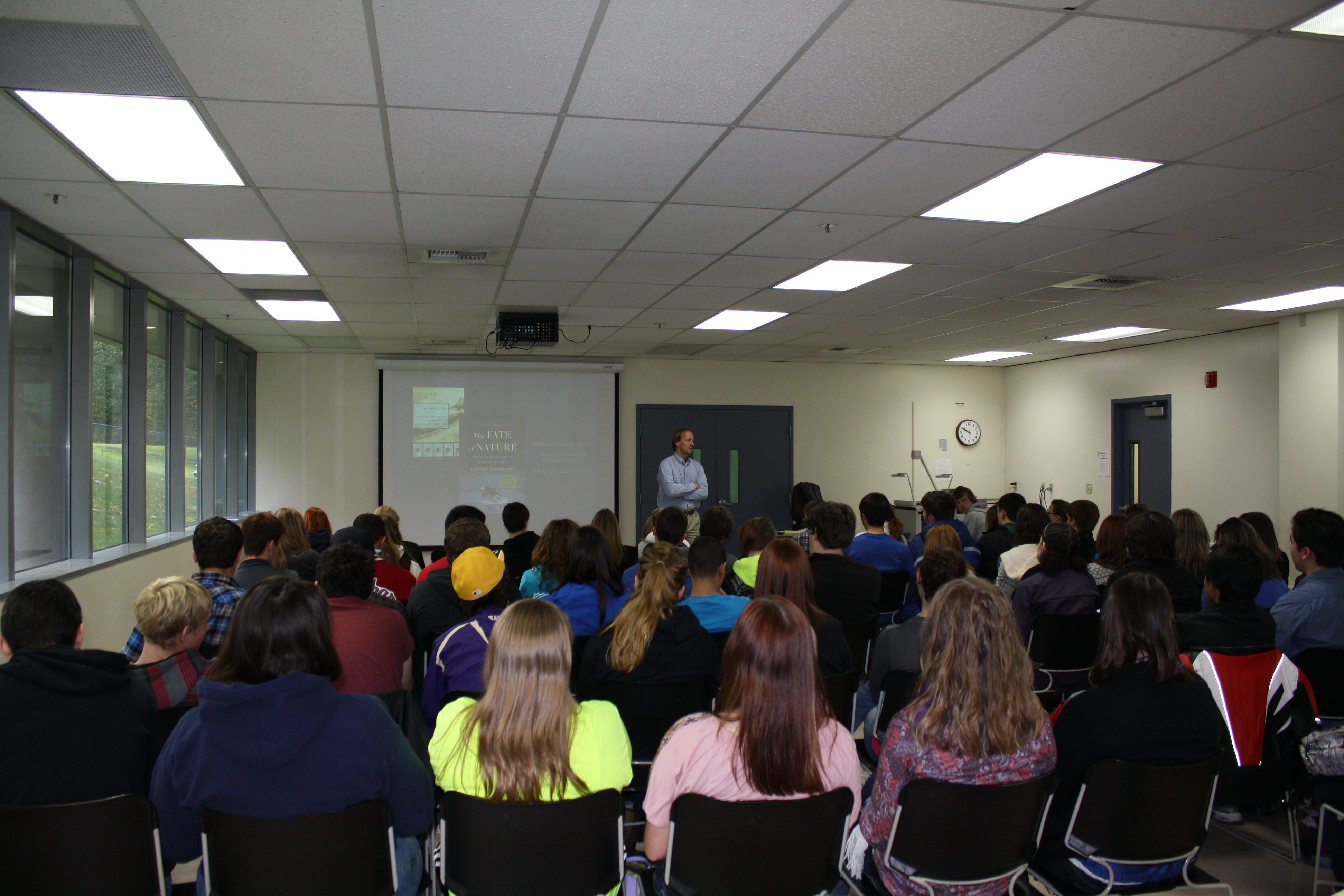 Charles Wohlforth is introduced to Ocean Research College Academy (ORCA) students in Everett, Washington.