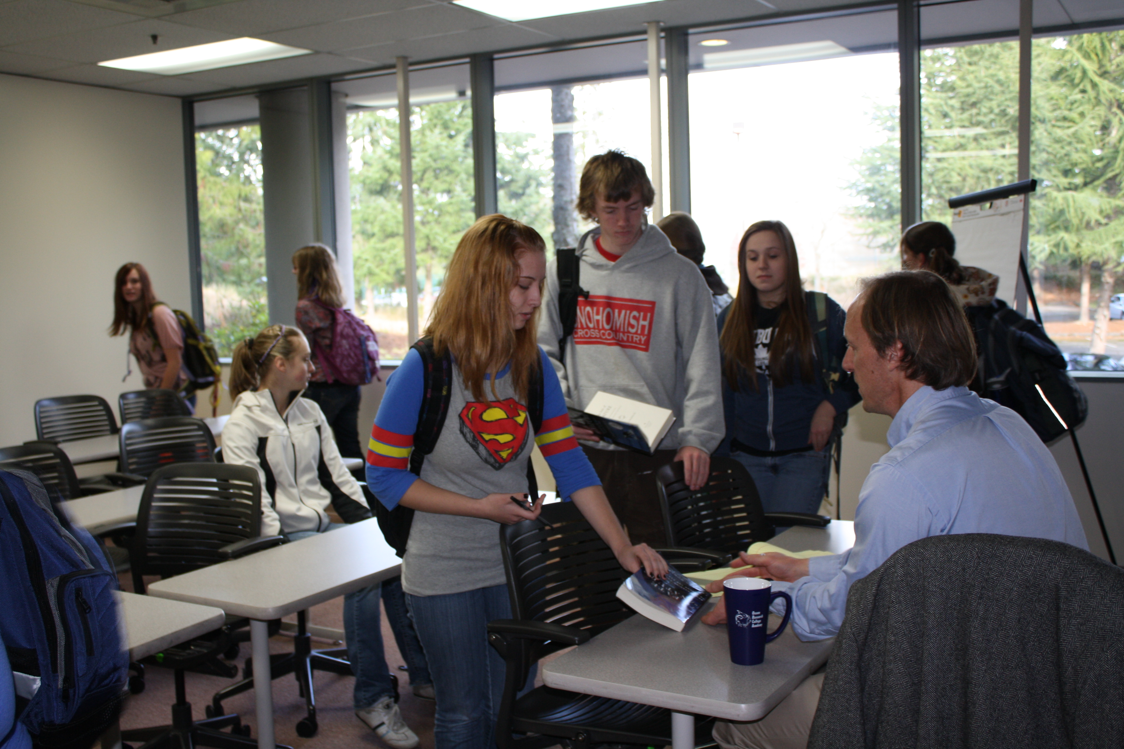 Following an hour-long question and answer session with ORCA students, Charles Wohlforth meets with students Sylvia Lundquist and Josh Burchfield. At the Ocean Research College Academy (ORCA) in Everett, Washington.