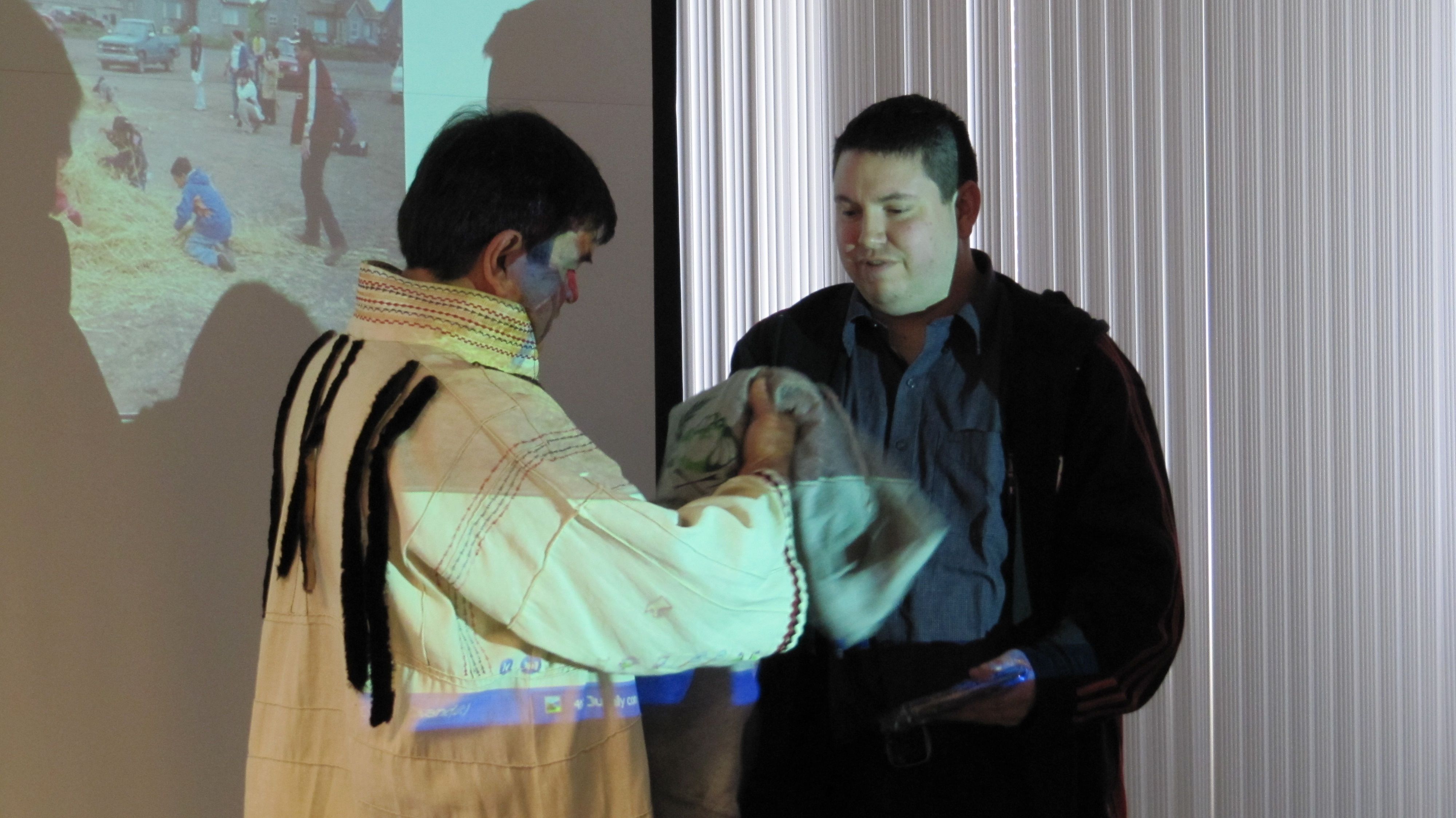 A Grand Ronde student presents a gift to Larry Merculieff. Western Oregon University in Monmouth, Oregon.