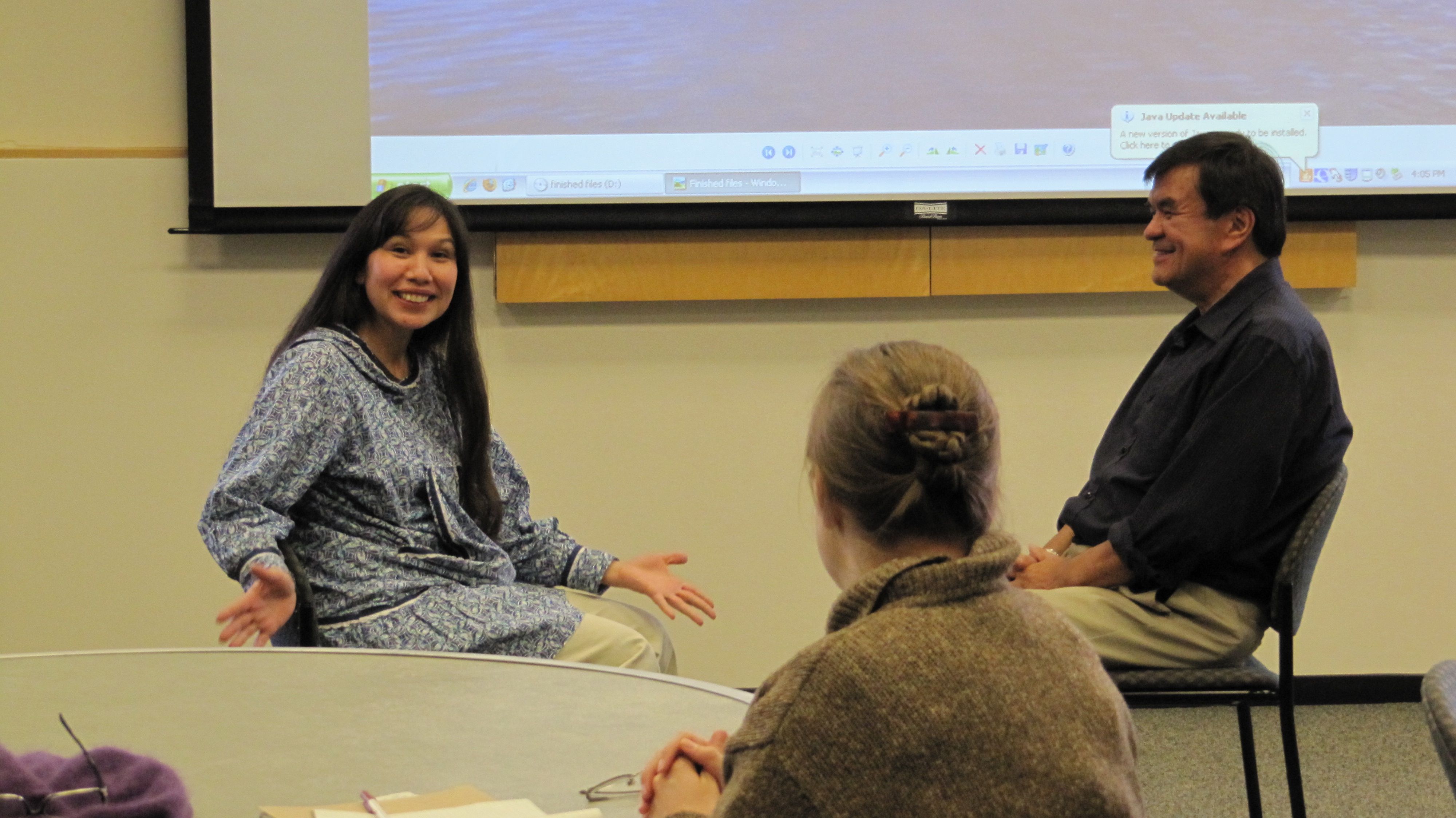 Roben Jack Larrison and Larry Merculieff demonstrate a team-building exercise. Western Oregon University in Monmouth, Oregon.