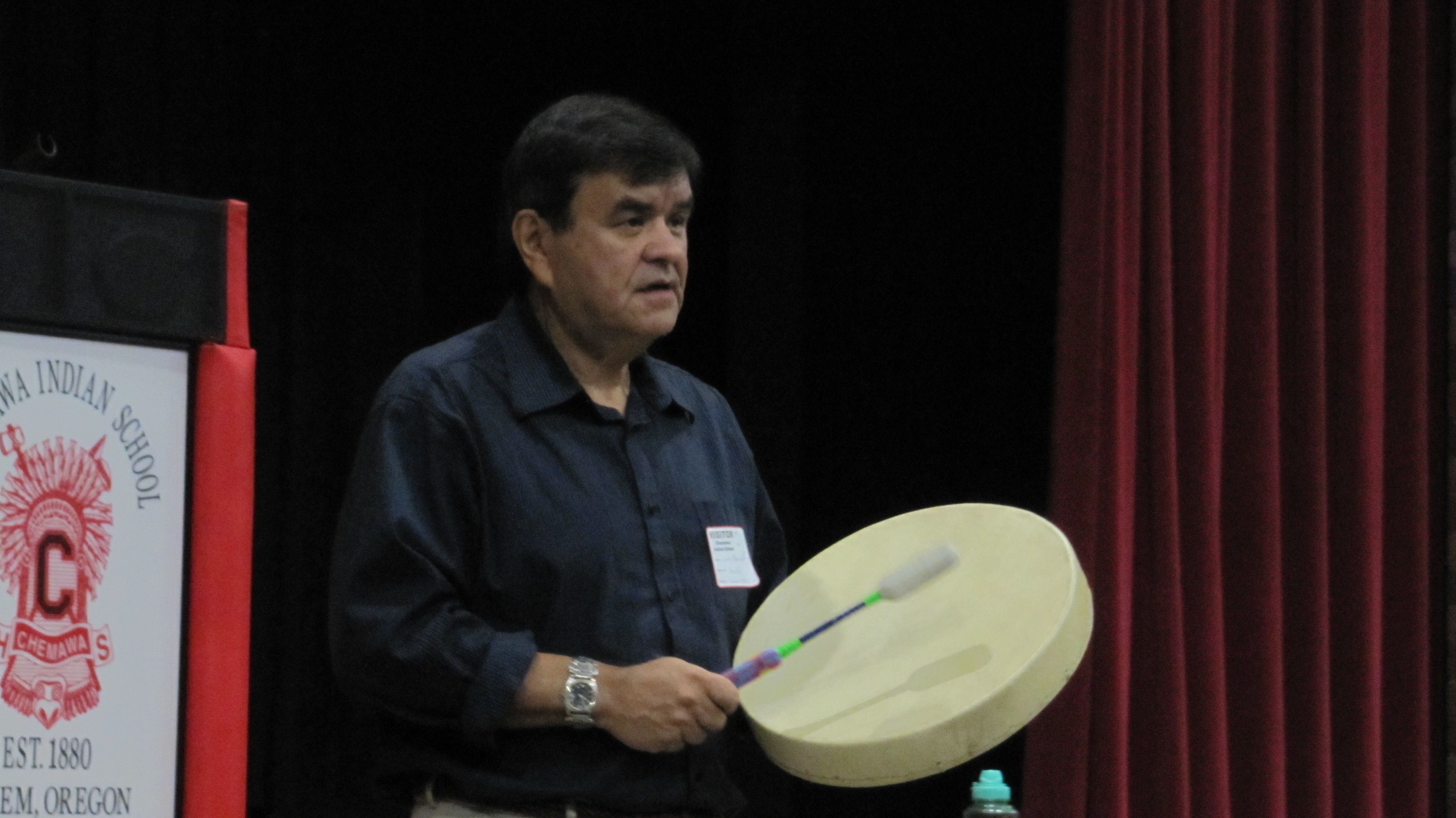 Larry Merculieff borrows a drum for a greeting song. Western Oregon University in Monmouth, Oregon.