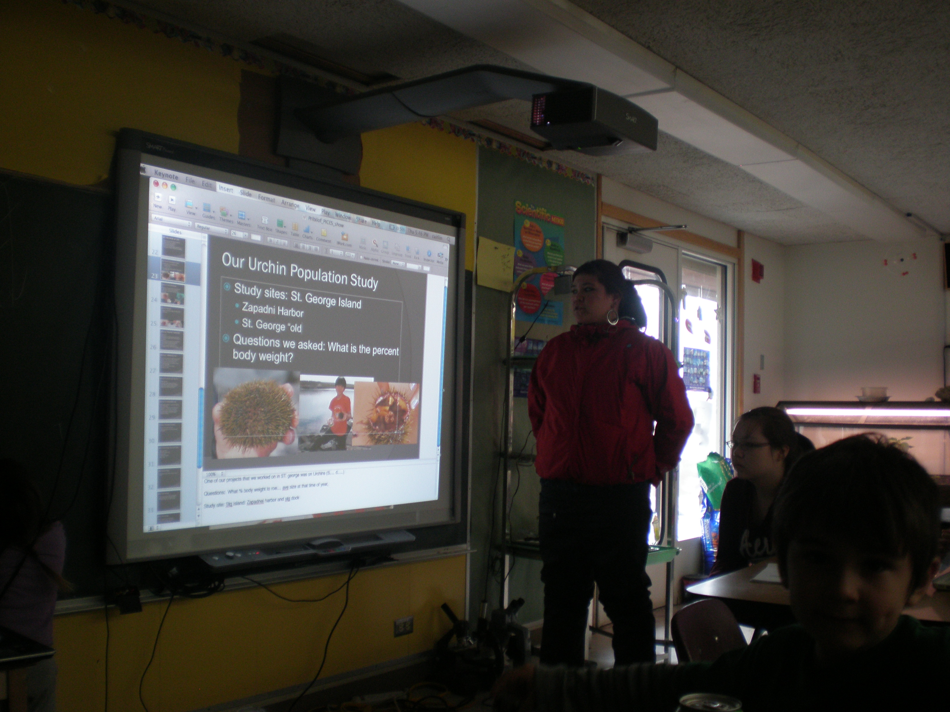 Pribilof High School Student Caitlin Bourdekovsky presents research on green sea urchins conducted during summer 2010 marine science camp. Michelle Ridgway visits St. Pribilof School District for Bering Sea Days festivities on St. Paul Island, Alaska.