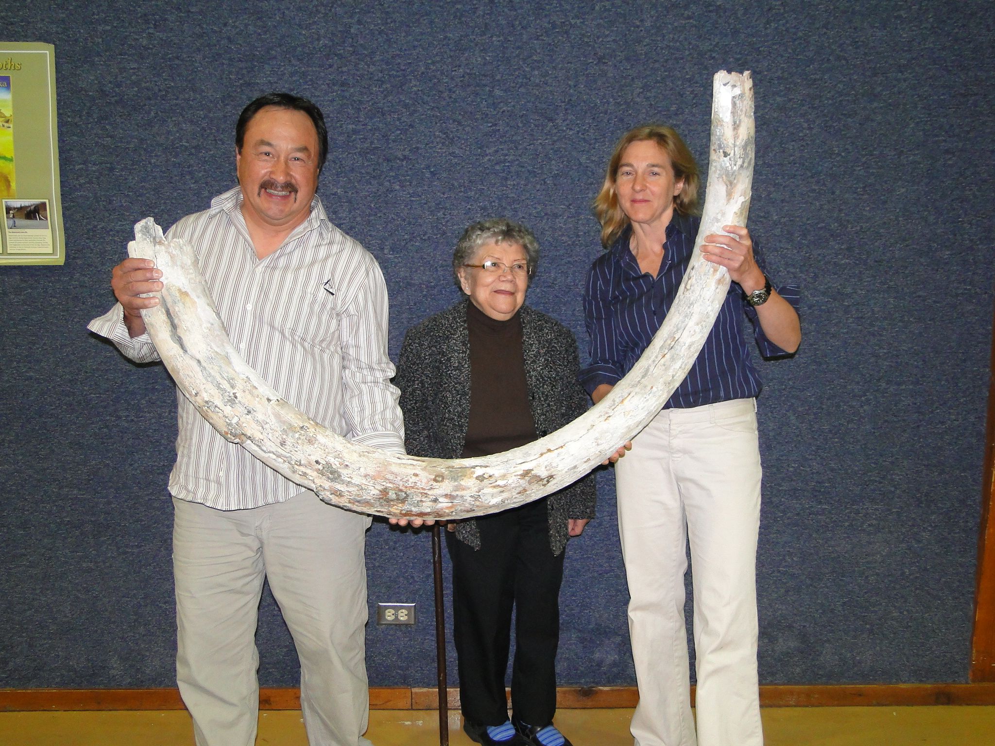 St. Paul Mayor Simeon Swetzov, Elder Mary Bourdekovsky and marine ecologist Michelle Ridgway with Swetzov’s treasure, a mammoth tusk from one of the last populations of the great Beringian mammals that lived on planet earth. St. Pribilof School District for Bering Sea Days festivities on St. Paul Island, Alaska.