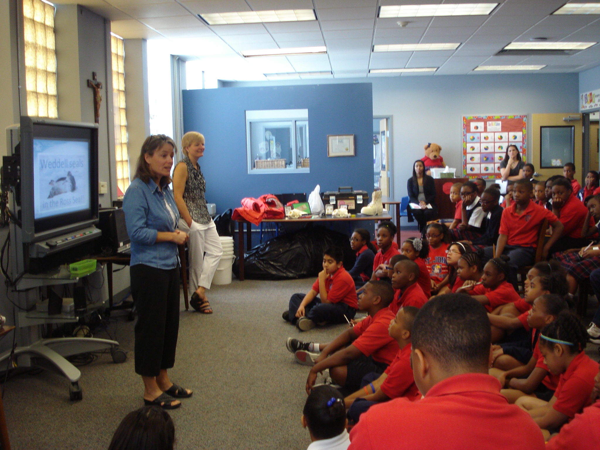 Alex Eilers and Dr. Jennifer Burns speak during the presentation to students at St. John Catholic School in Memphis, Tennessee.
