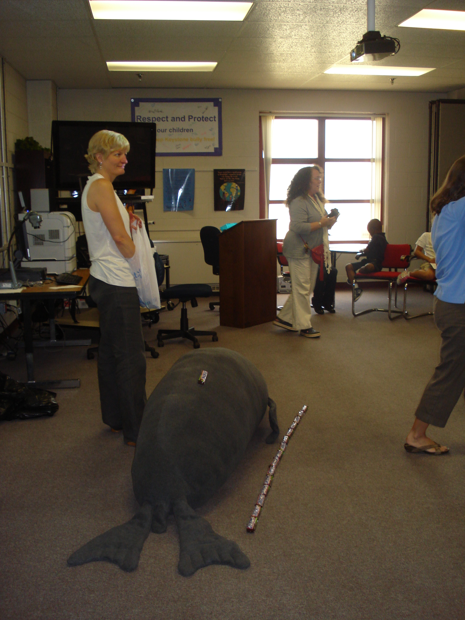 Dr. Jennifer Burns demonstrates how the team used Snicker bars to measure the standard length of a Weddell seal at Keystone Elementary School in Memphis, Tennessee.