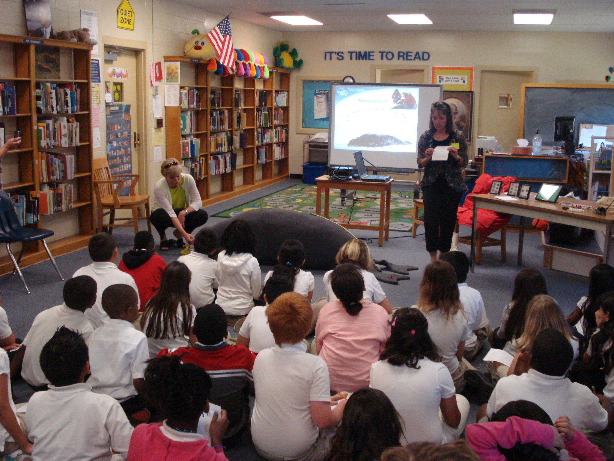 Alex Eilers and Dr. Jennifer Burns demonstrate how they record the measurements of Weddell seals. At Jackson Elementary School in Memphis, Tennessee.