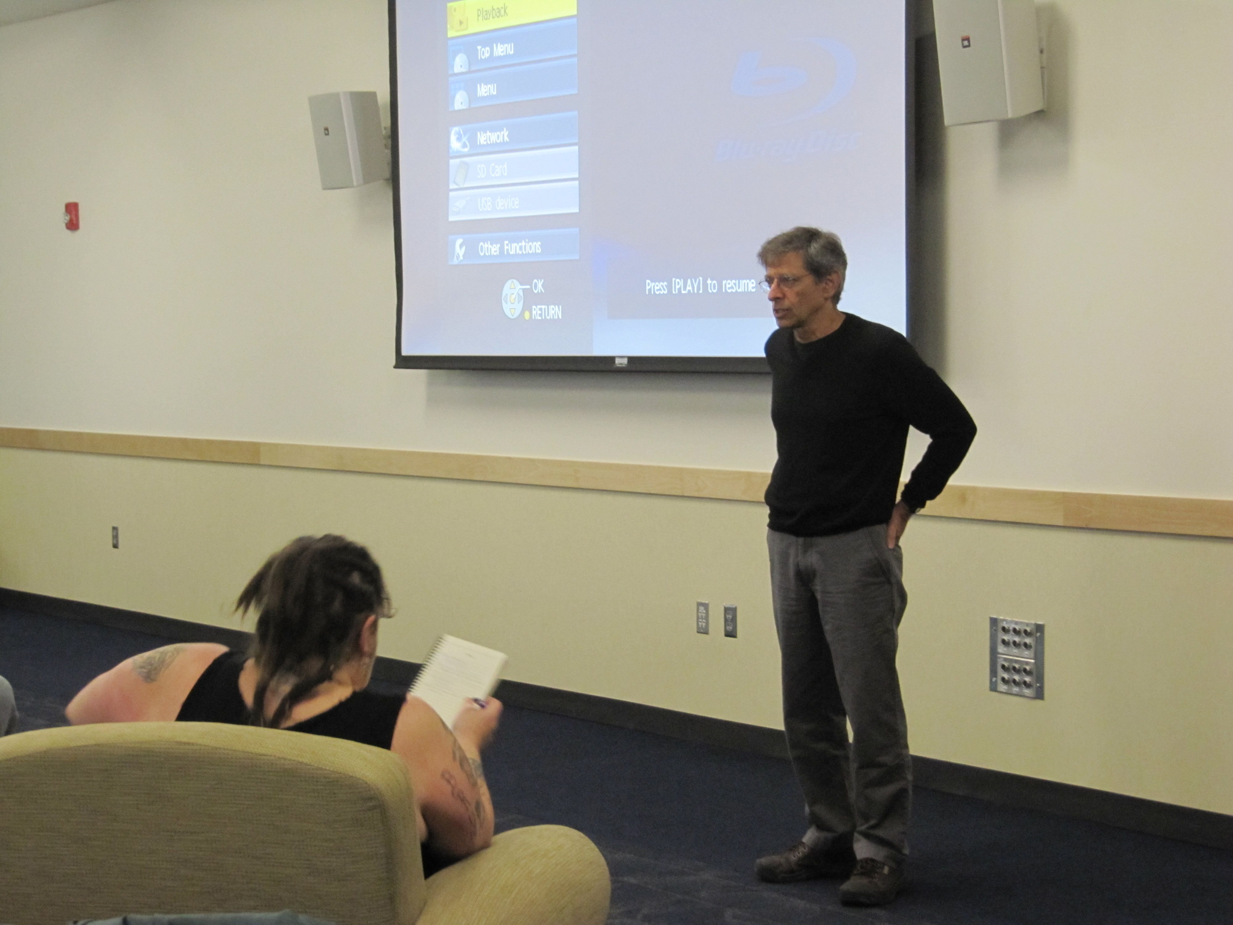 Leonard Kamerling introduces his work to a joint meeting of a Political Science class and an Anthropology class at Western Oregon University in Monmouth, Oregon.