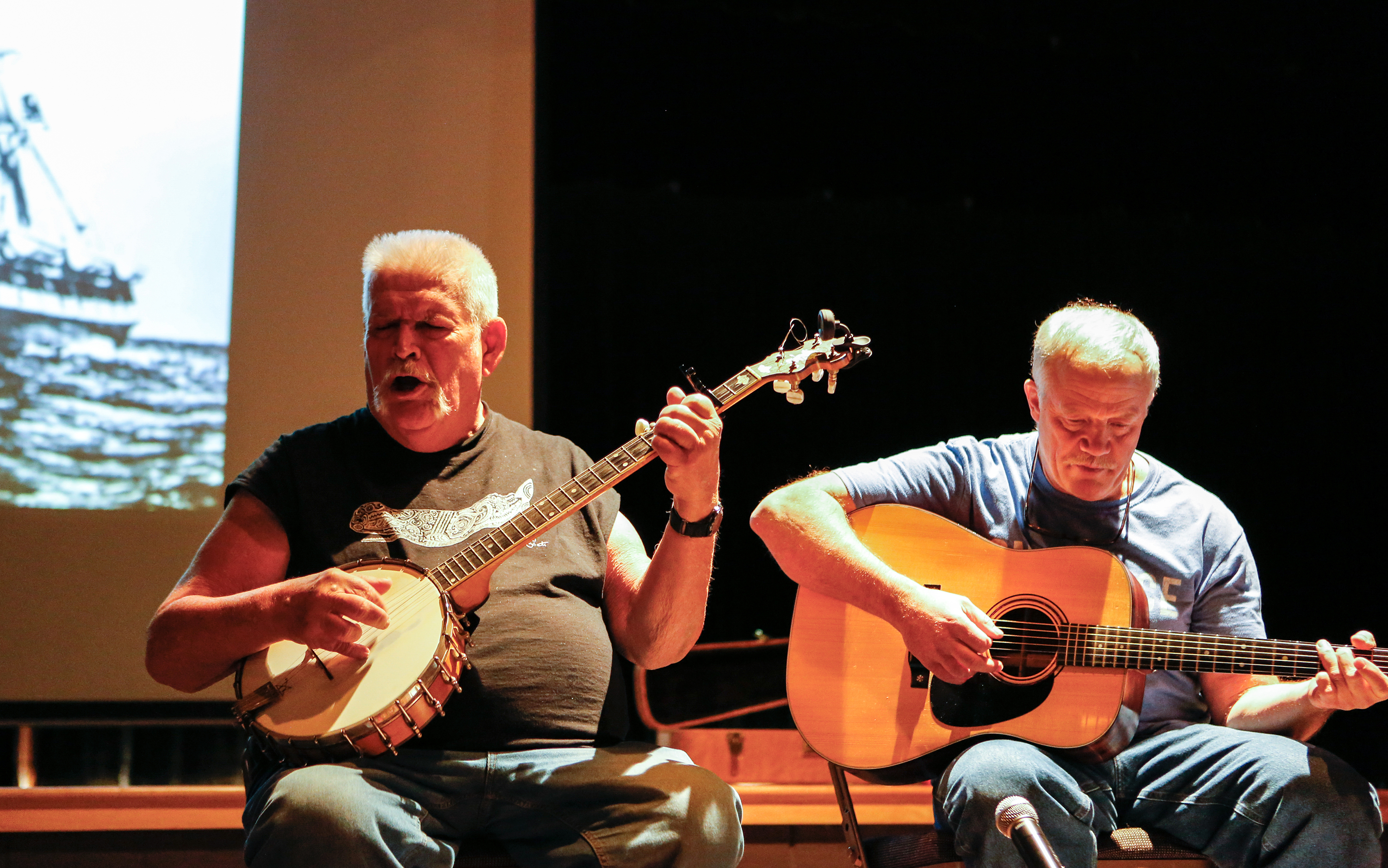 Craig George and Don Sineti play music together during their symposium lecture on The Cultural Exchange of Whaling Traditions. Sitka, Alaska.