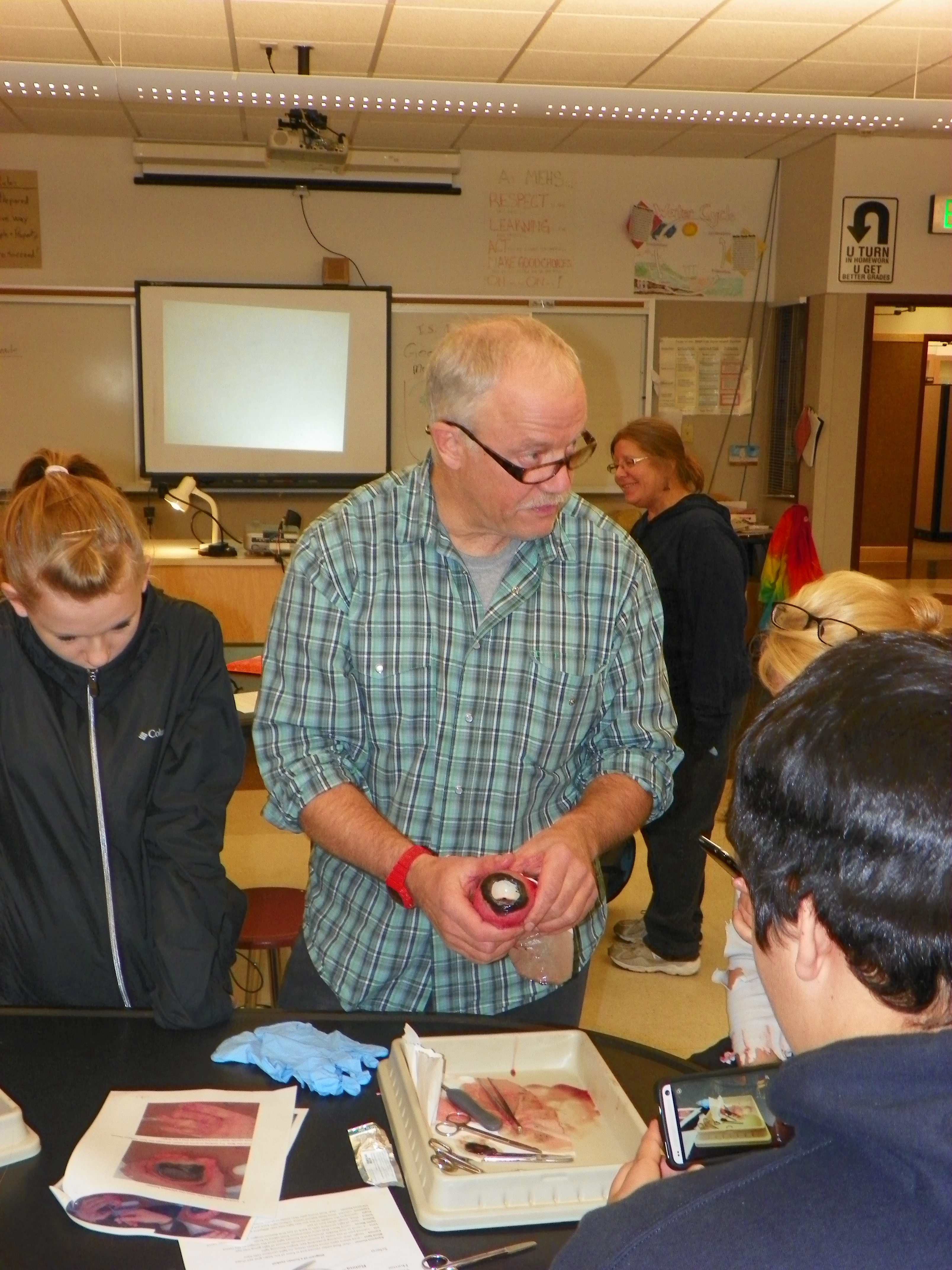 Craig George gives a lesson on comparative anatomy between cow and bowhead whale eyeballs at Mt. Edgecumbe High School in Sitka, Alaska.