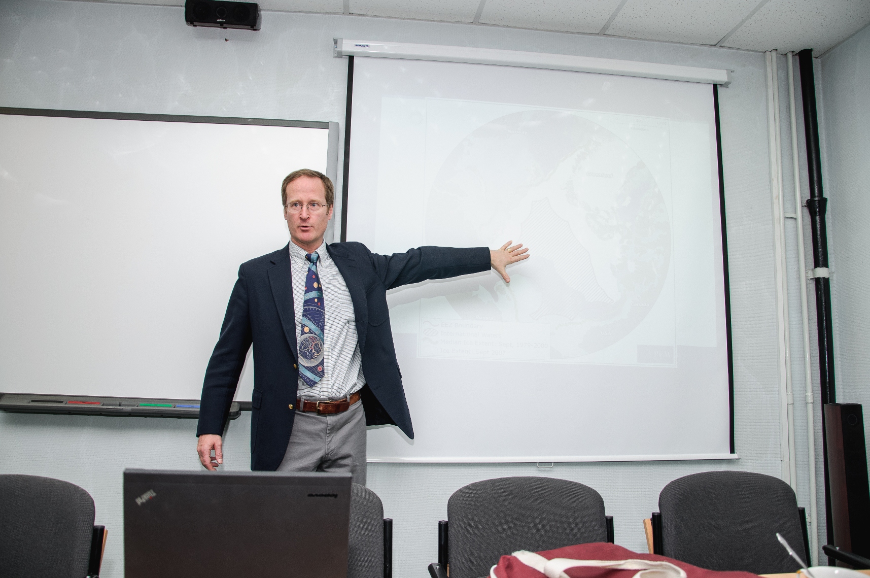 Henry Huntington gives his lecture about the central Arctic Ocean at the North-Eastern Federal University, Neryungri, Sakha Republic, Russia.