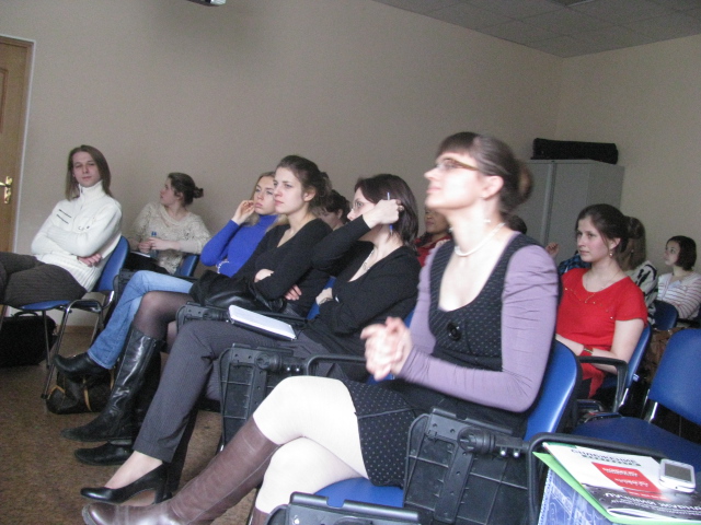 Students in the journalism department attend a presentation by Sarah Hurst at the St. Petersburg State University, St. Petersburg, Russia.