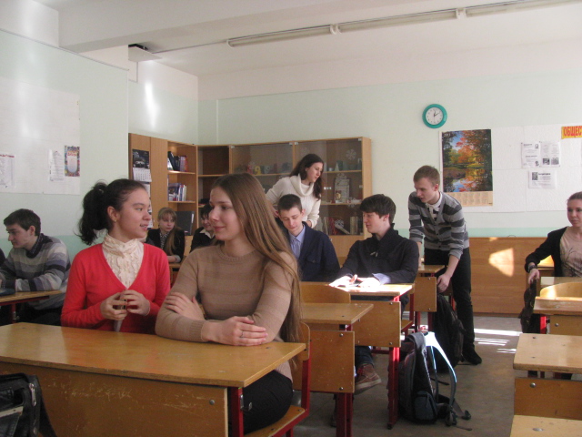 Students attend a presentation by Sarah Hurst at School #534. St. Petersburg, Russia.