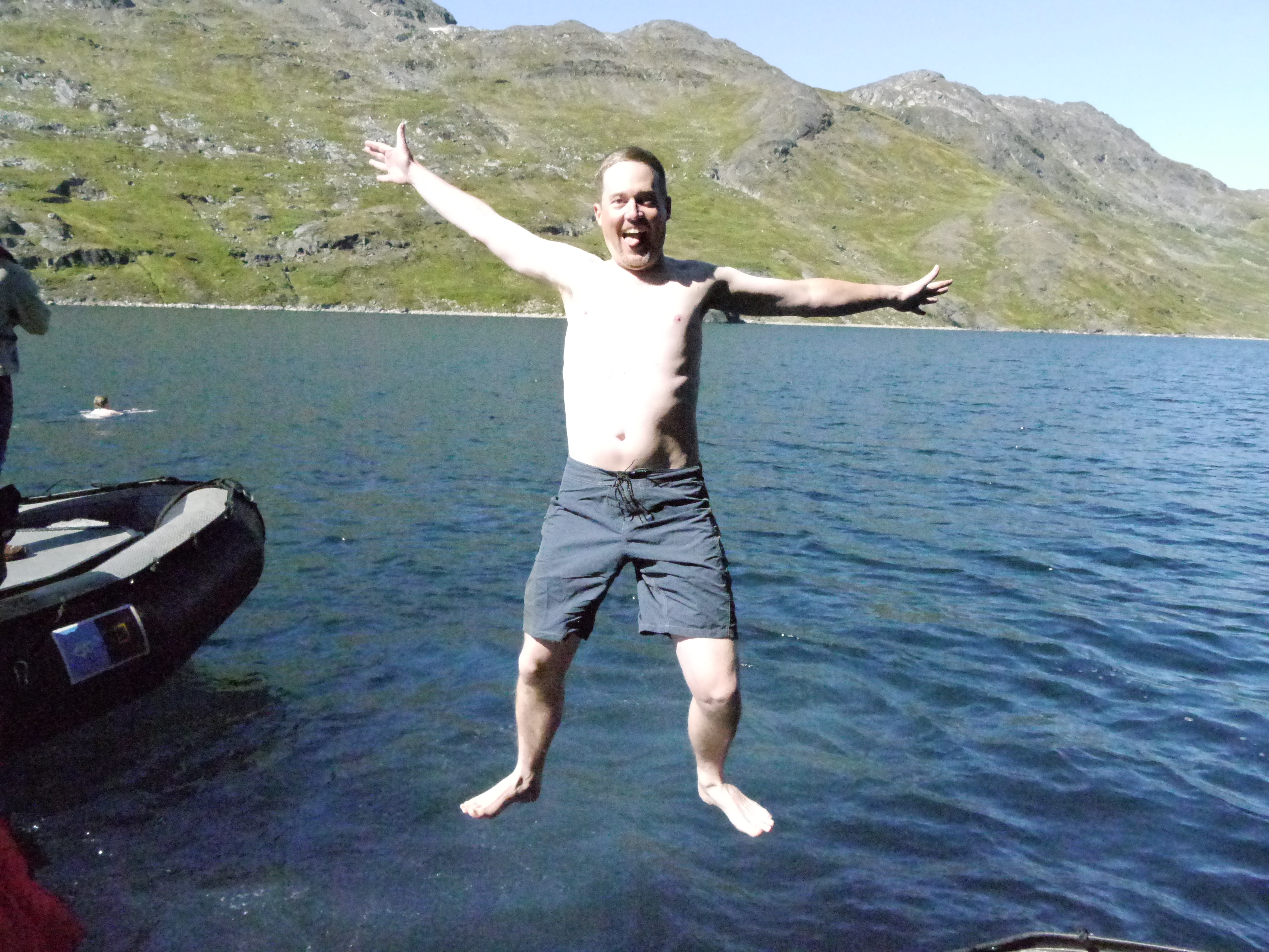 Bill Schmoker participates in the grand tradition of taking a polar plunge in Sangmissoq Fjord, Southwest Greenland.