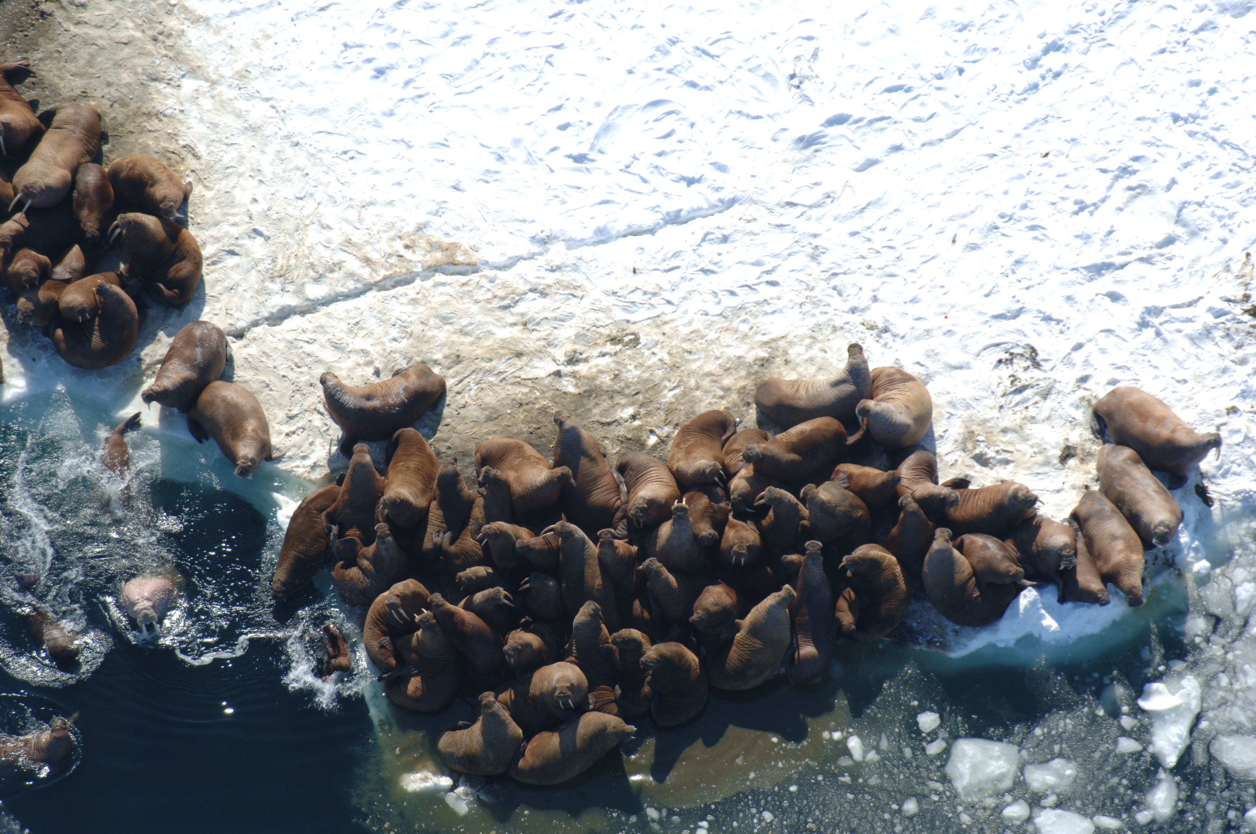 Walrus (Odobenus rosmarus) hauled out on the ice of the Bering Sea, seen during the April 2006 US Fish and Wildlife Service (USFWS) Walrus Survey.
