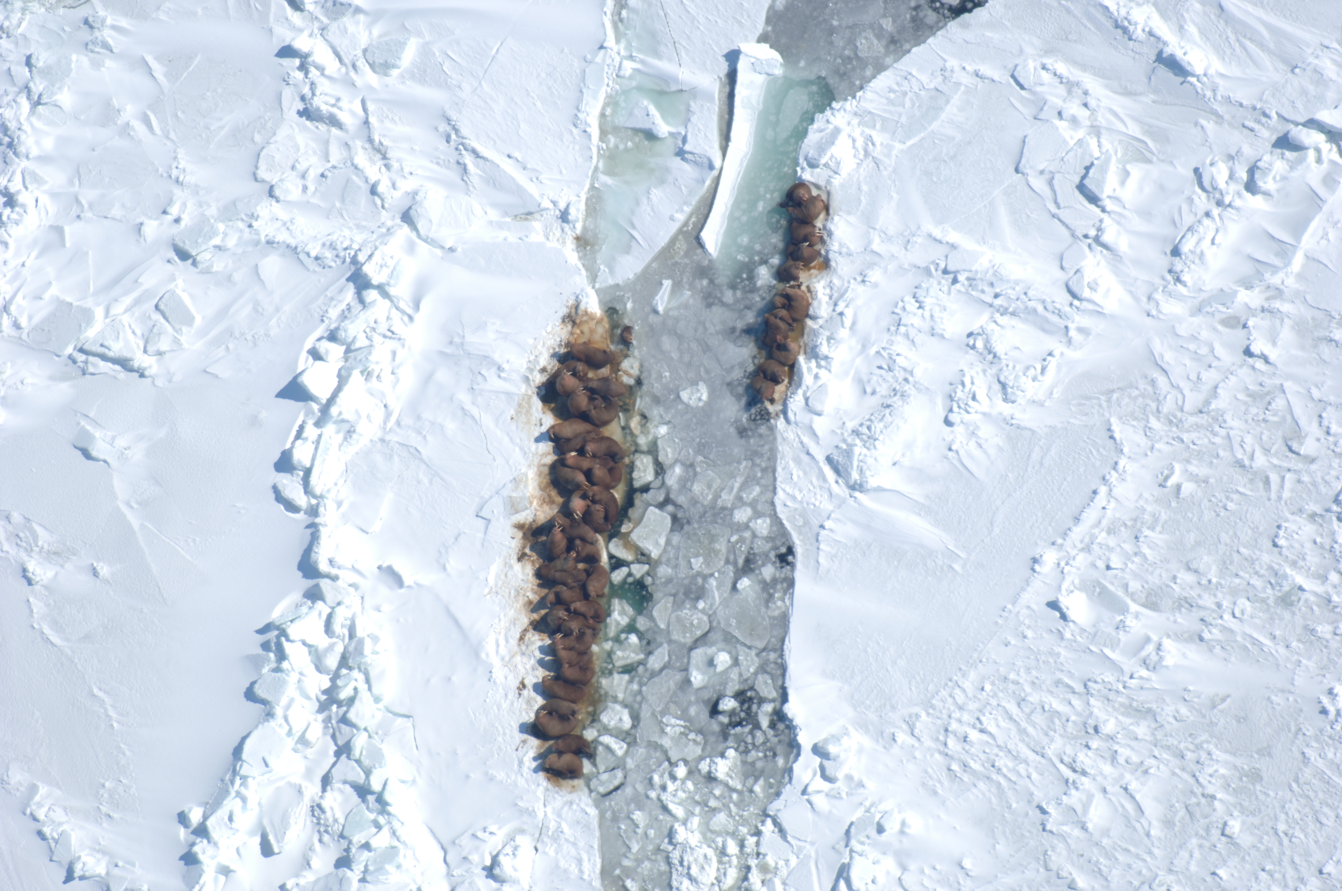 Walrus (*Odobenus rosmarus*) hauled out on the ice of the Bering Sea, seen during the April 2006 US Fish and Wildlife Service (USFWS) Walrus Survey.