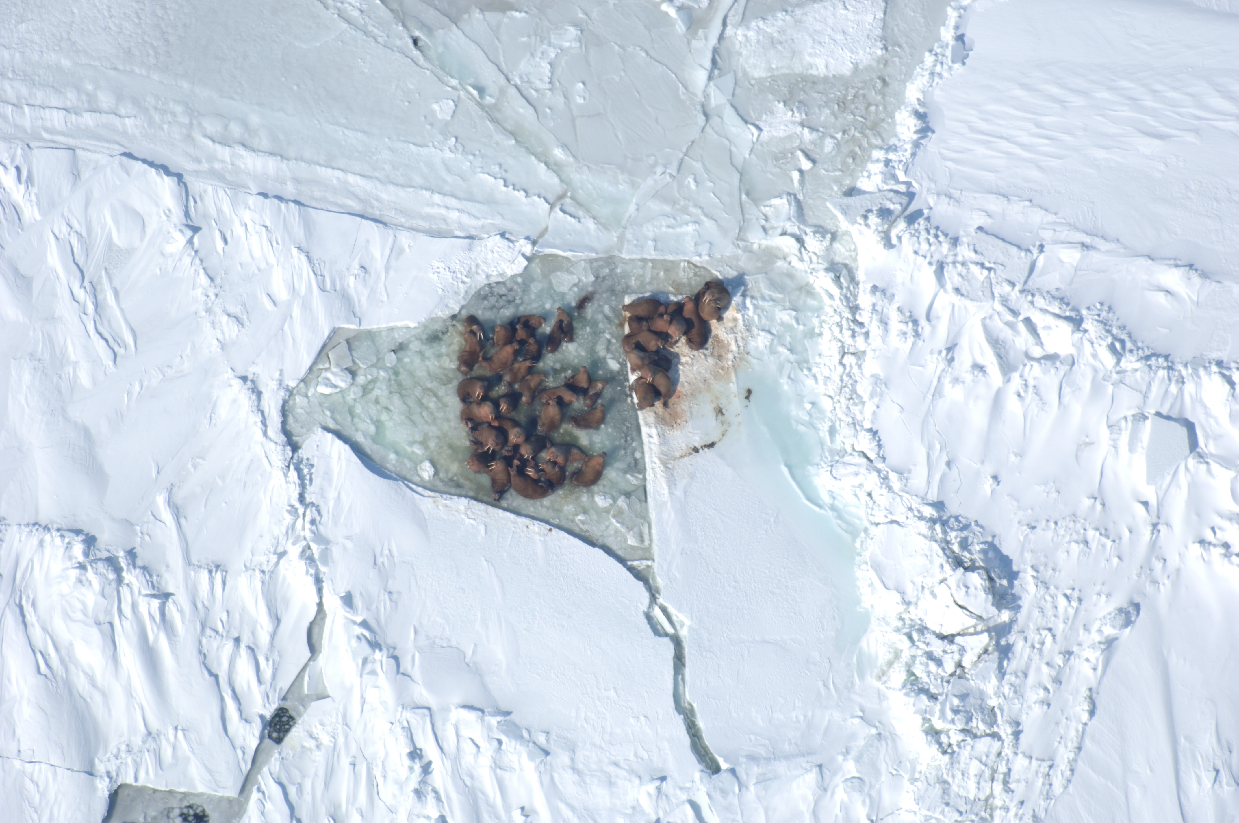 Walrus (*Odobenus rosmarus*) hauled out on the ice of the Bering Sea, seen during the April 2006 US Fish and Wildlife Service (USFWS) Walrus Survey.