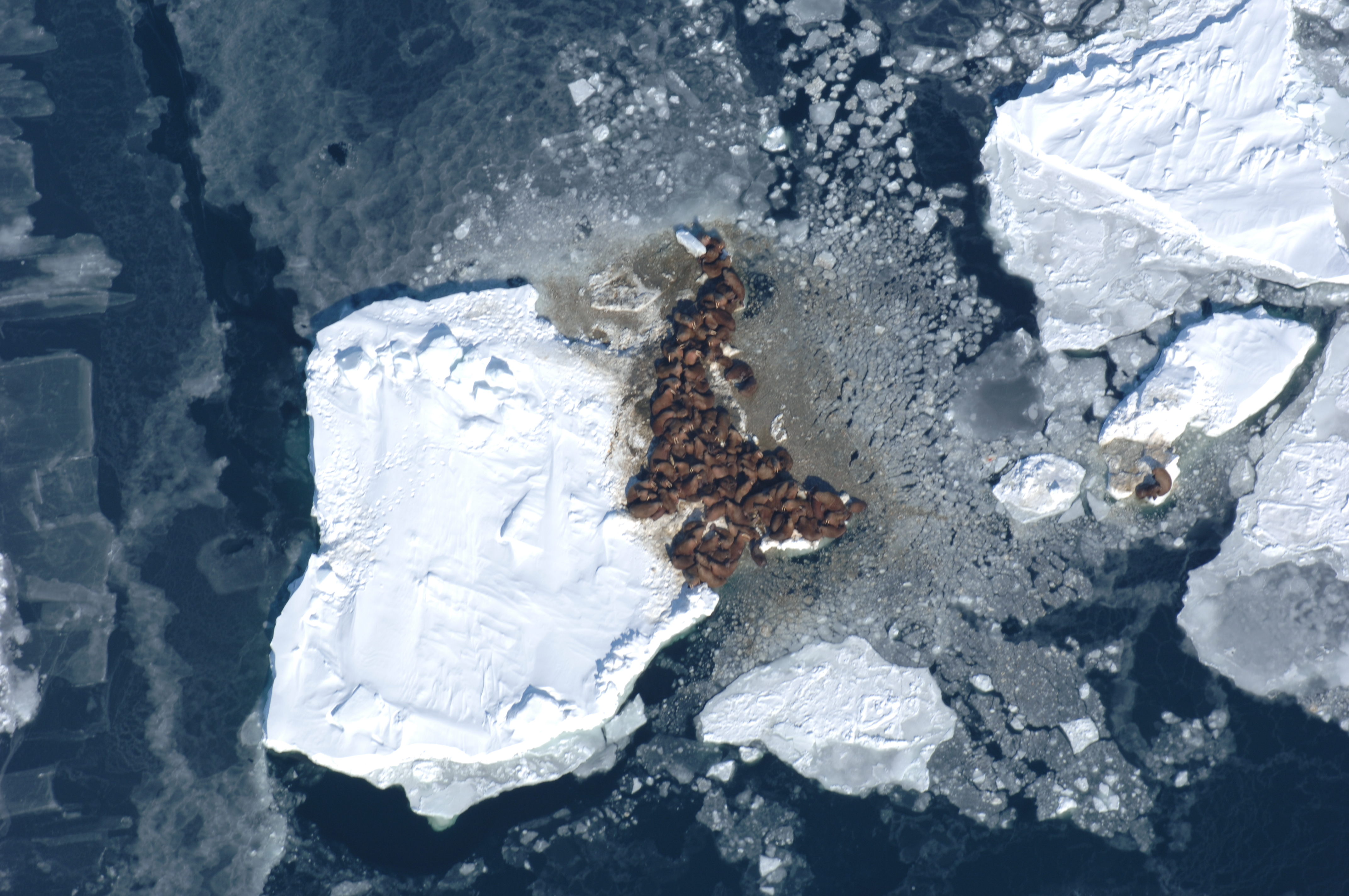 Walrus (*Odobenus rosmarus*) hauled out on the ice of the Bering Sea, seen during the April 2006 US Fish and Wildlife Service (USFWS) Walrus Survey.