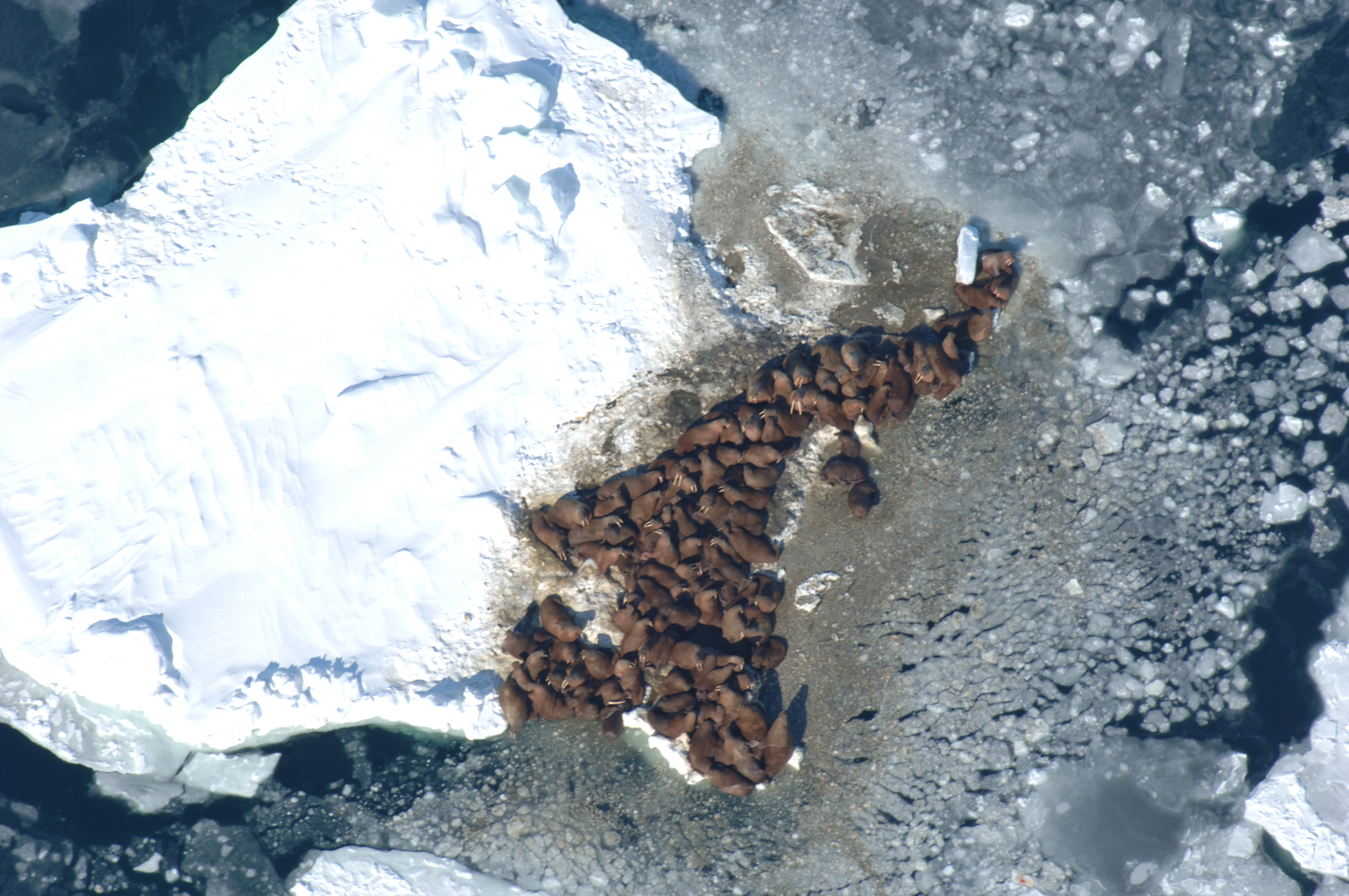 Walrus (*Odobenus rosmarus*) hauled out on the ice of the Bering Sea, seen during the April 2006 US Fish and Wildlife Service (USFWS) Walrus Survey.