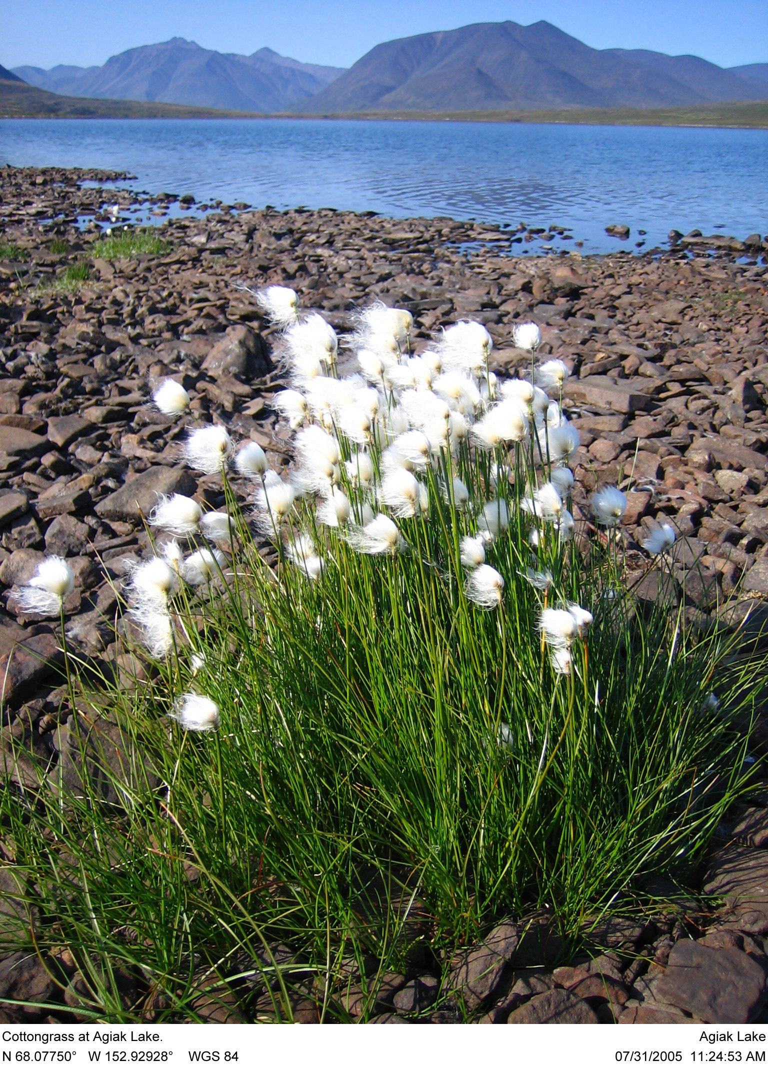 Cotton grass on the Agiak Lake shoreline, Gates of the Arctic National Park, central Brooks Range, Alaska.