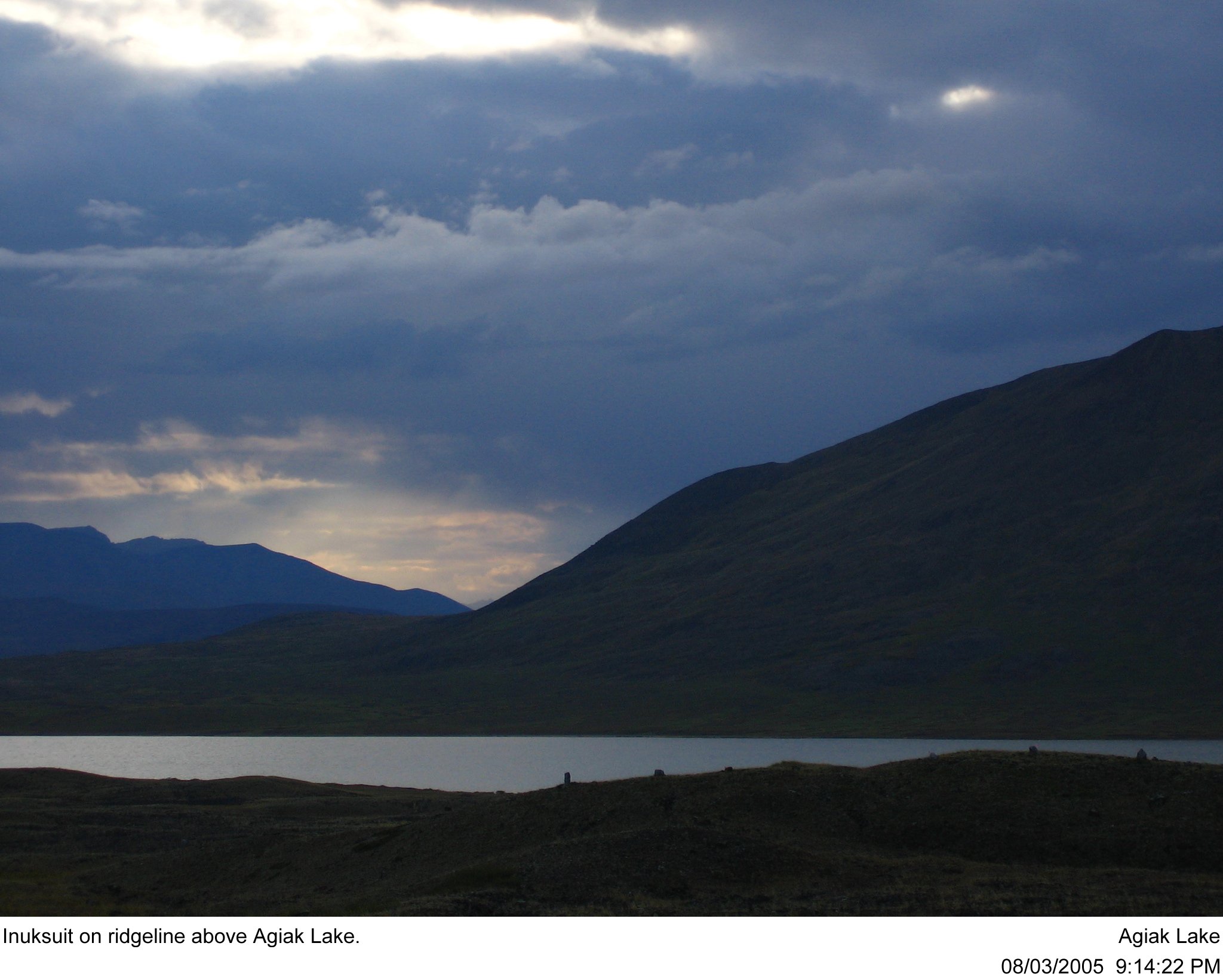 View of Agiak Lake at dusk with inuksuit visible on the horizon, Gates of the Arctic National Park, central Brooks Range, Alaska.