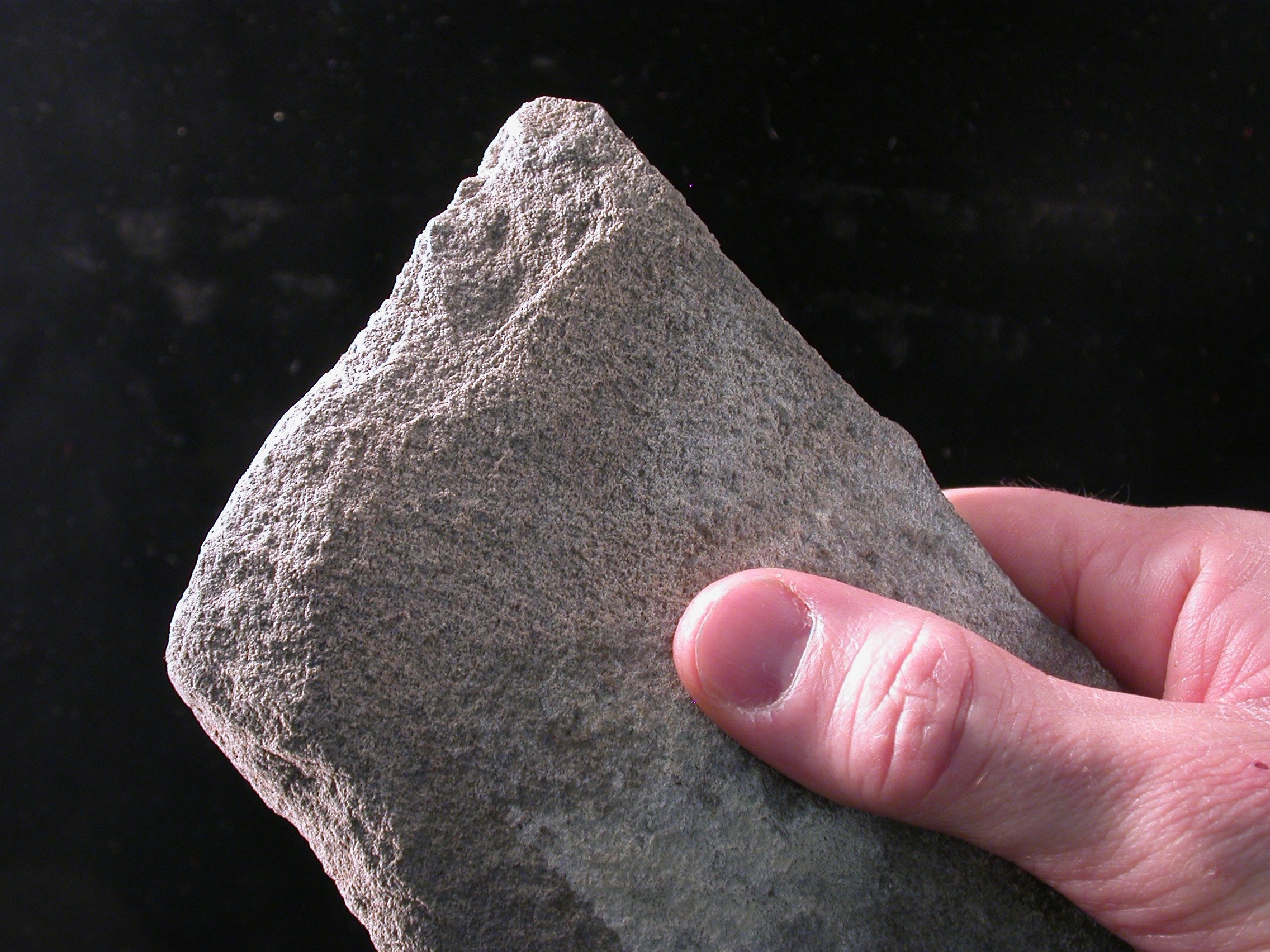 Example of a flaked, coarse stone slab tool from Hungry Fox, possibly used to break bones for marrow extraction, found in Gates of the Arctic National Park and Preserve, central Brooks Range, Alaska.