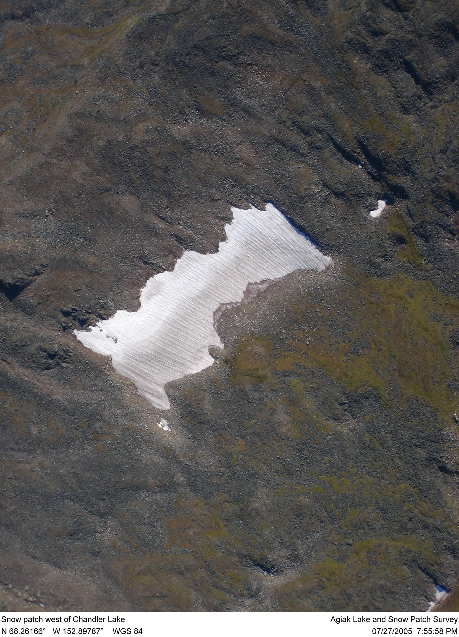 A snow patch in Gates of the Arctic National Park, central Brooks Range, Alaska. Photo taken in July 2005