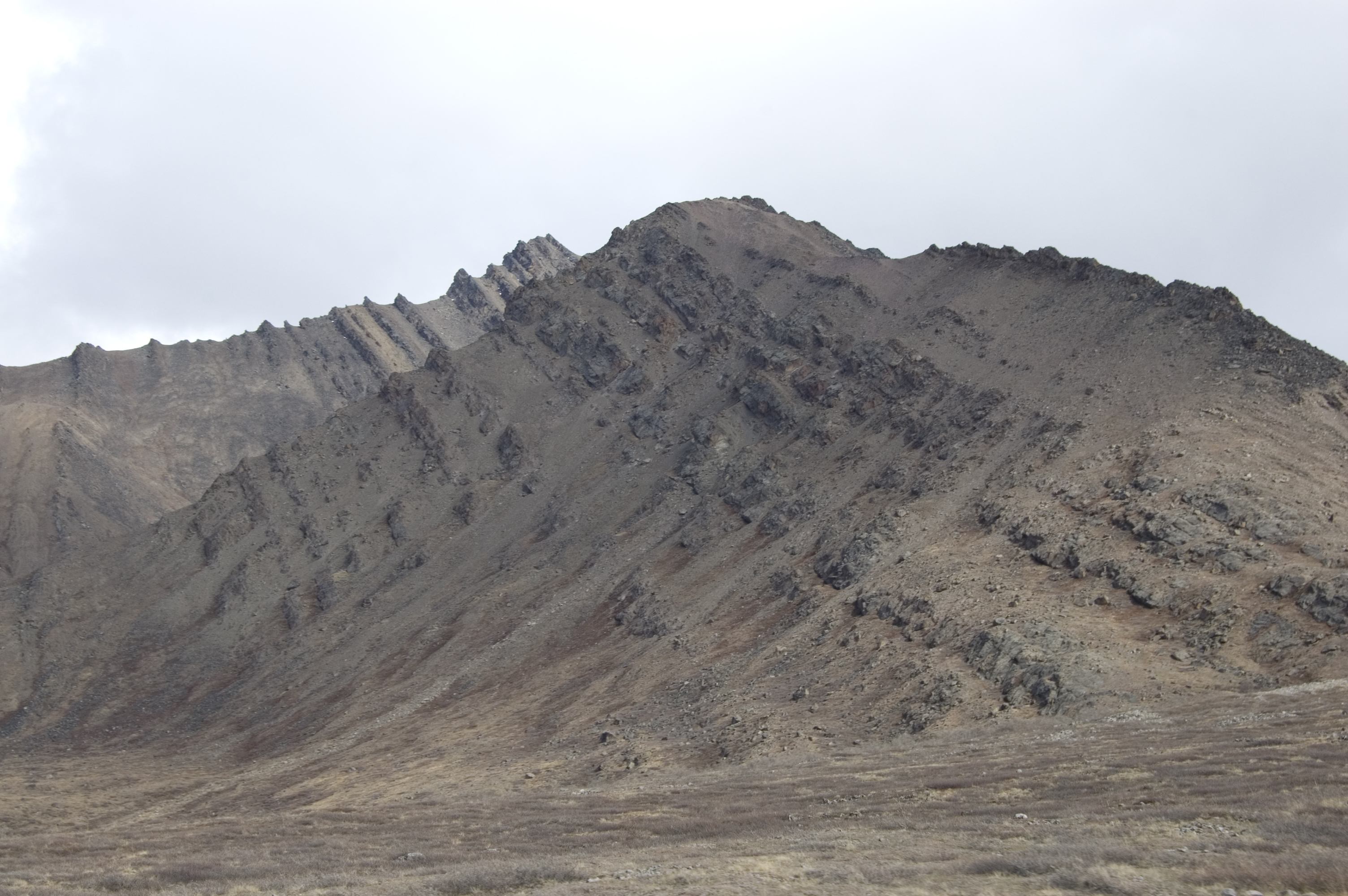 Tilted layers in a mountain, north of Atigun Pass in the Brooks Range, Alaska.
