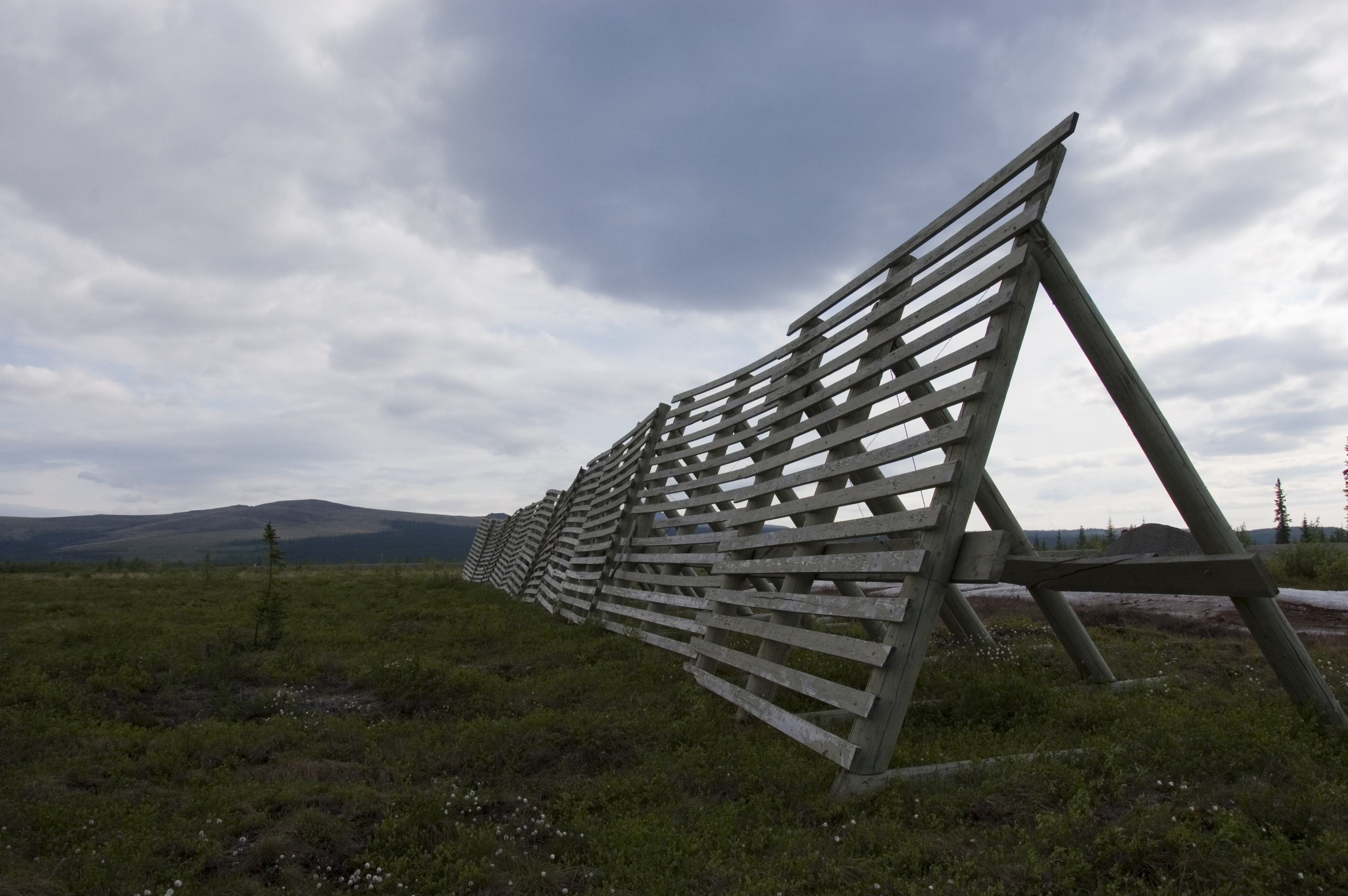 A snowdrift barrier to protect the highway. Near the Kanuti River on the Dalton Highway in Alaska.
