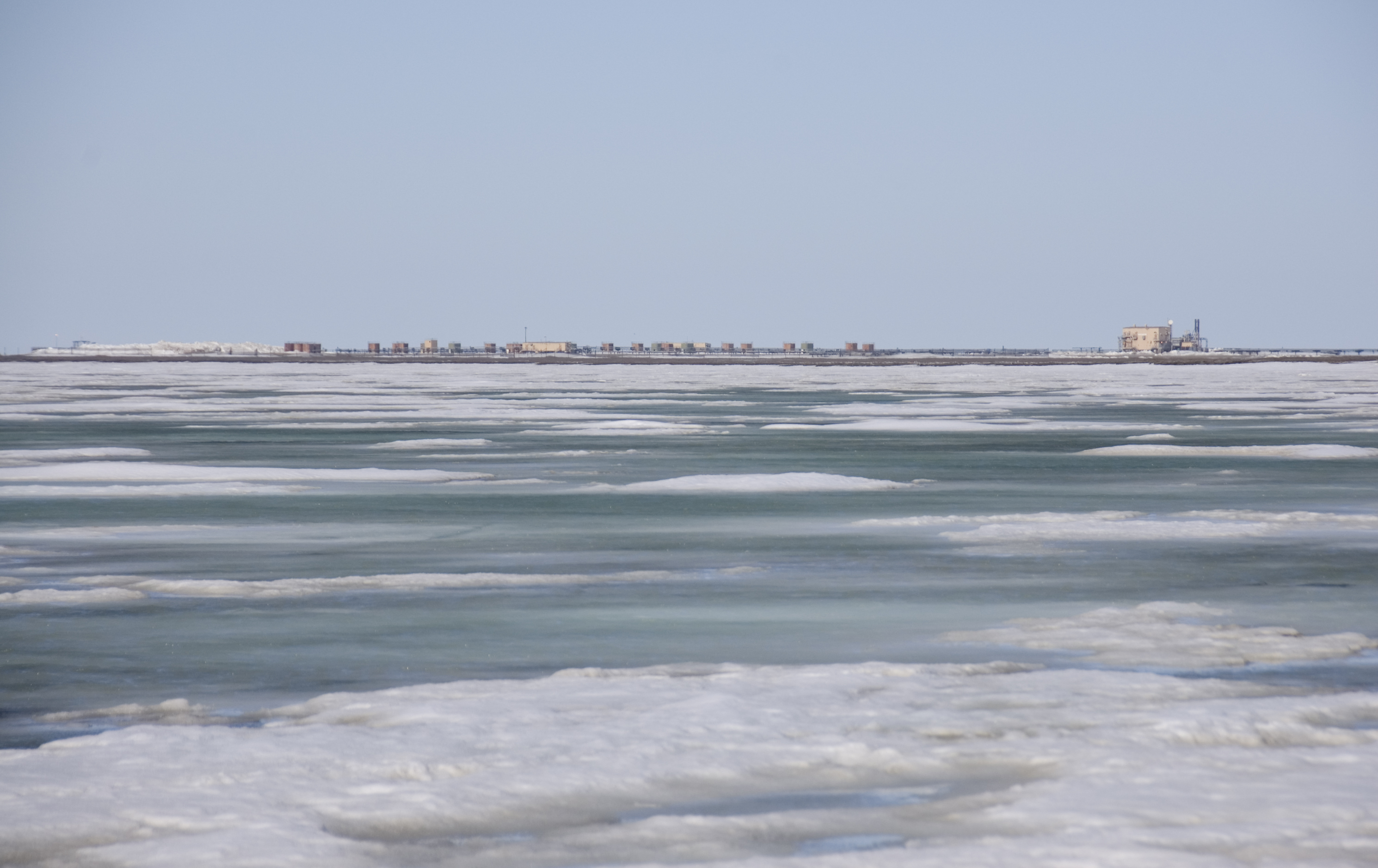The Arctic Ocean as seen from East Dock in Prudhoe Bay, Alaska. Buildings in Prudhoe Bay can be seen in the background, across the bay.