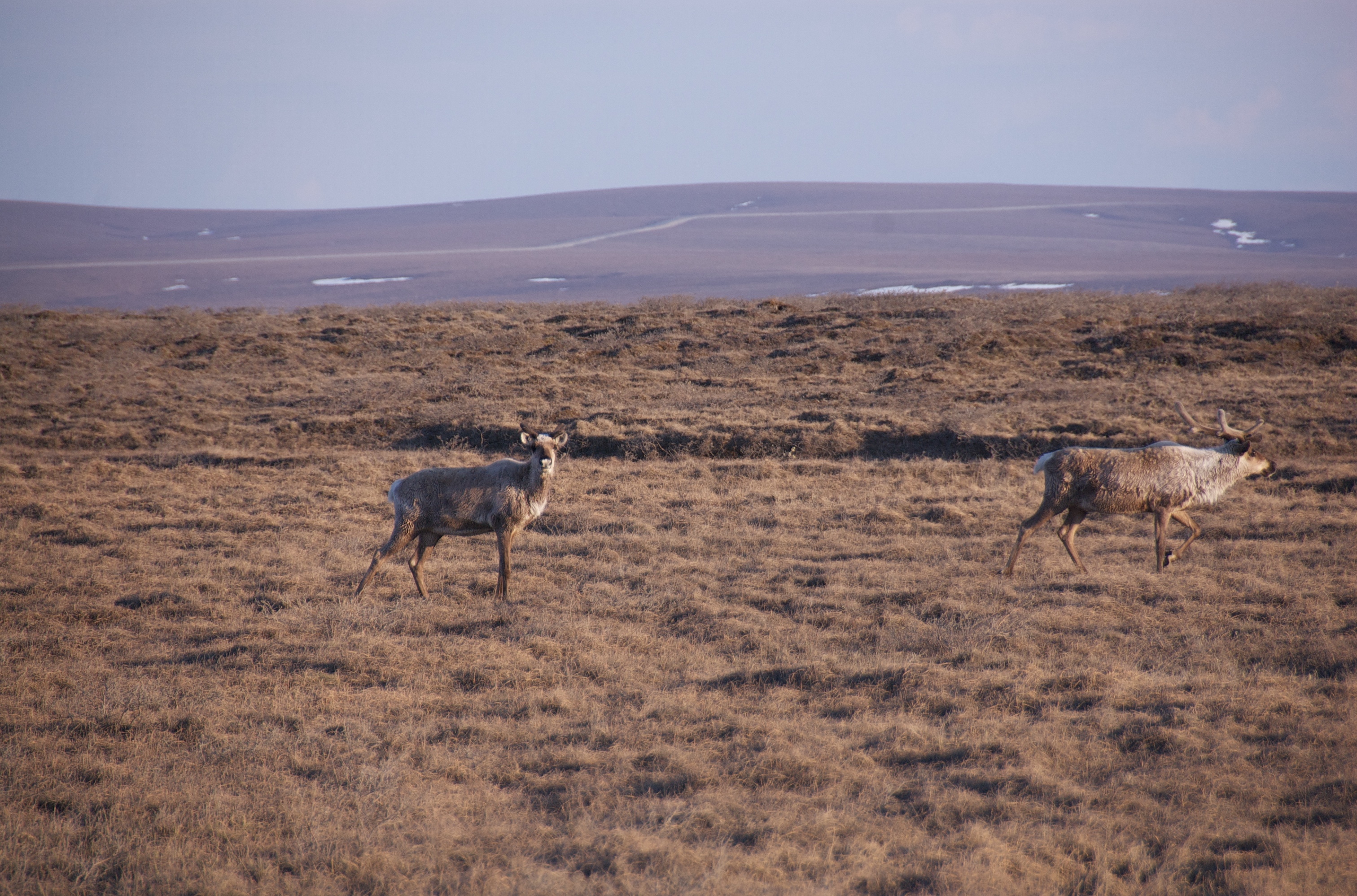 Two caribou on the North Slope on the Dalton Highway in Alaska.