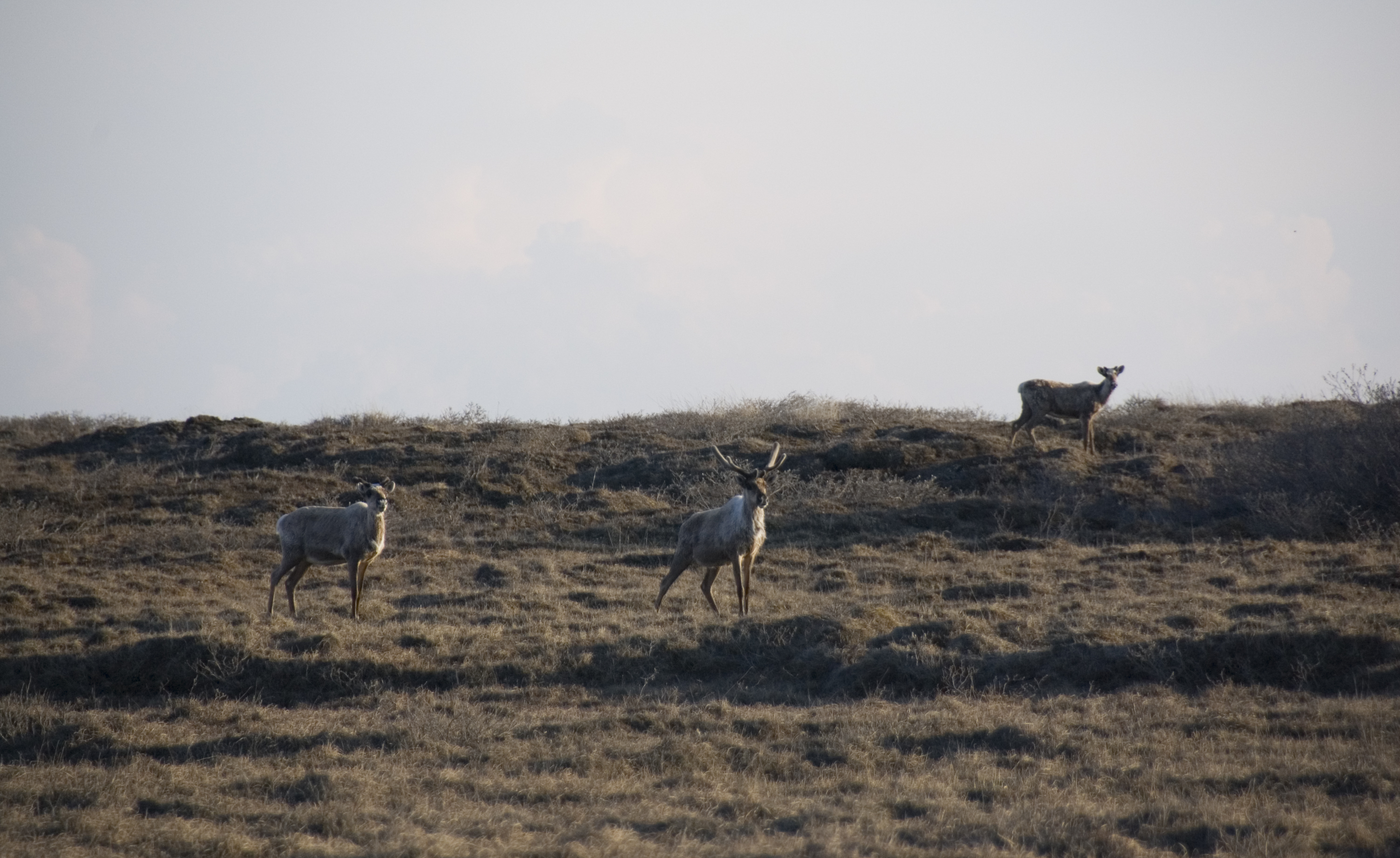 Three caribou on the North Slope on the Dalton Highway in Alaska.