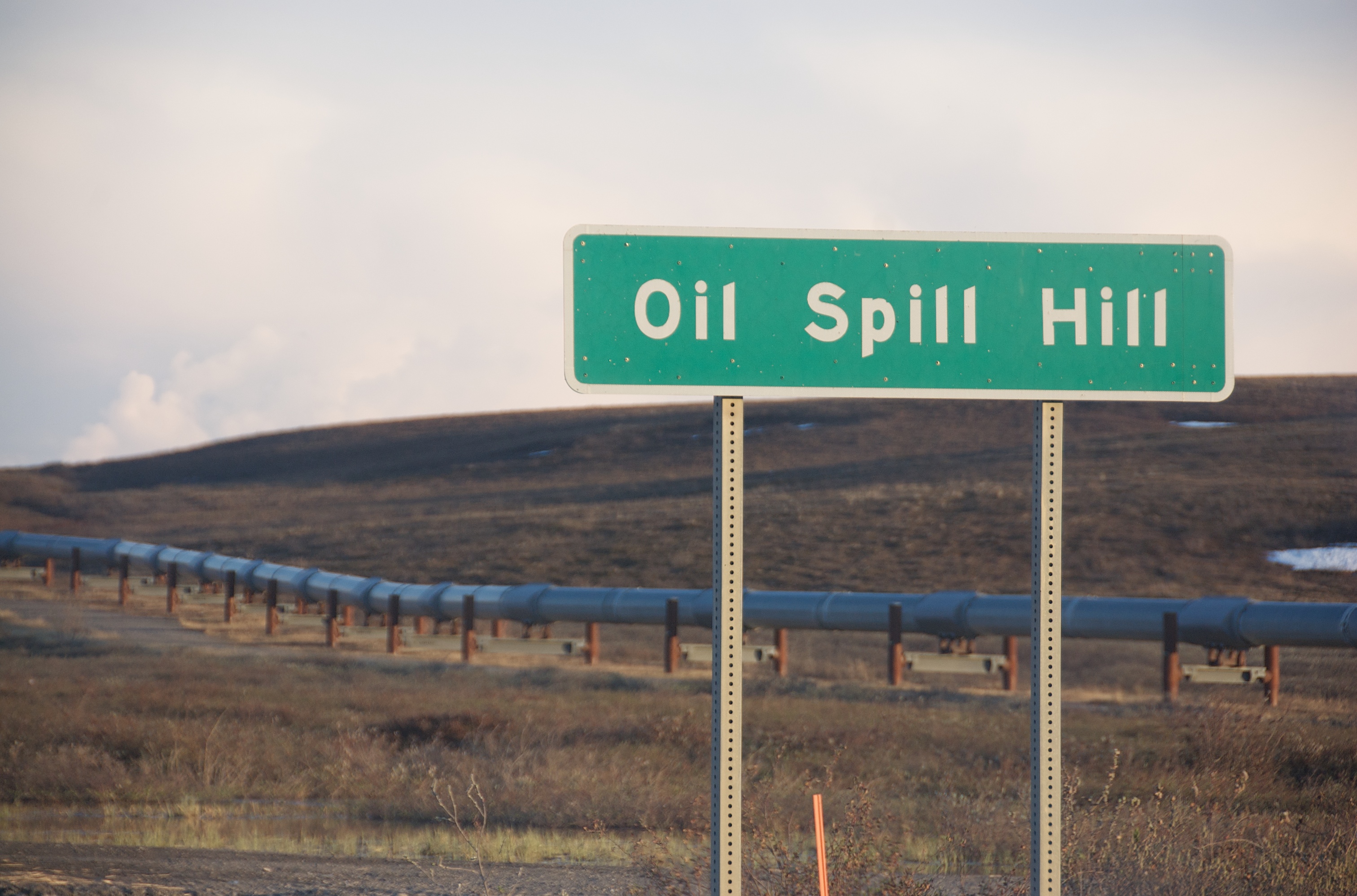 A sign for Oil Spill Hill, with the Trans Alaska Pipeline in the background. On the North Slope on the Dalton Highway in Alaska.
