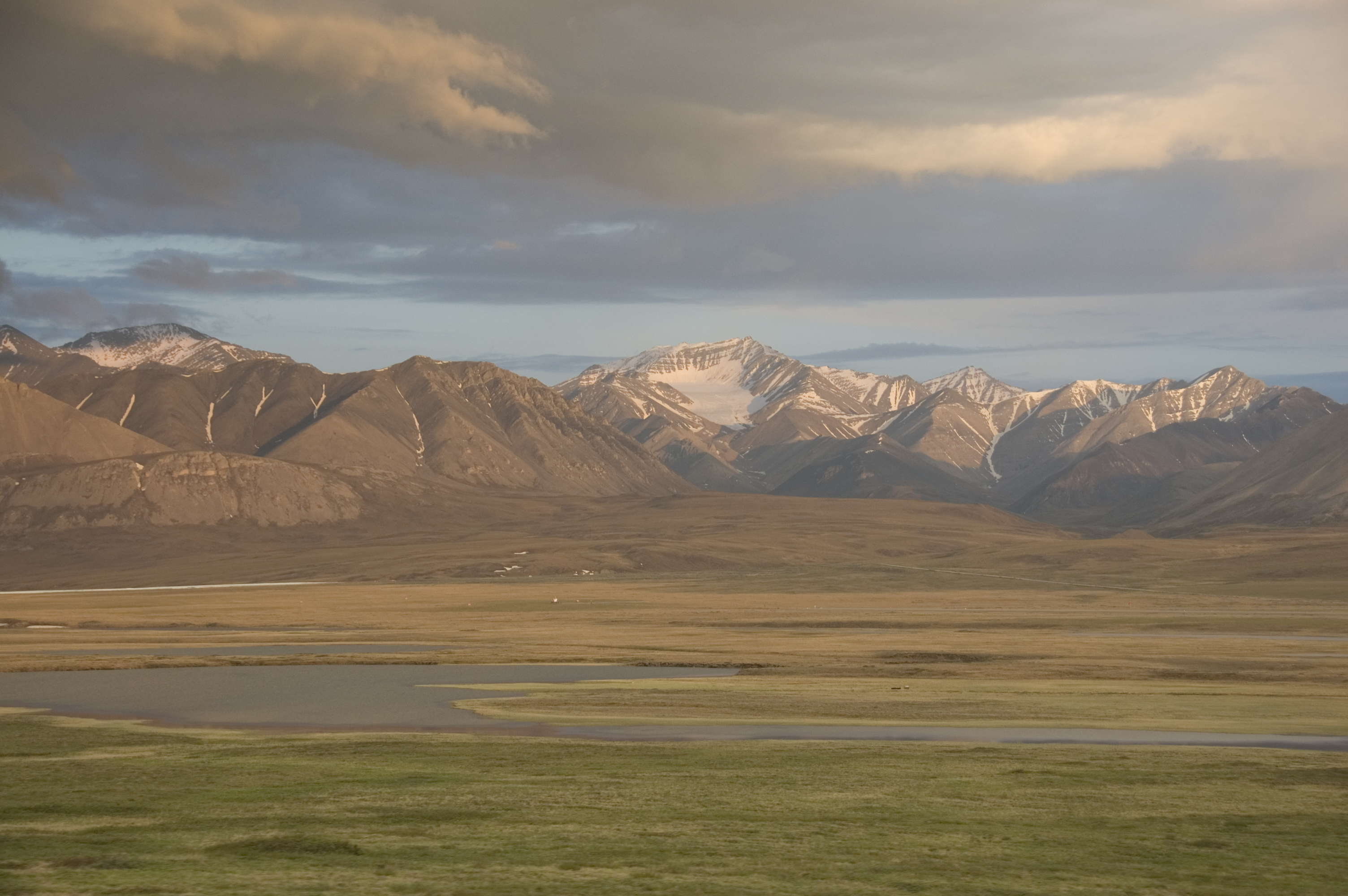 The midnight sun illuminates mountains at Galbraith Lake on the north side of Atigun Pass on the Dalton Highway in the Brooks Range, Alaska.