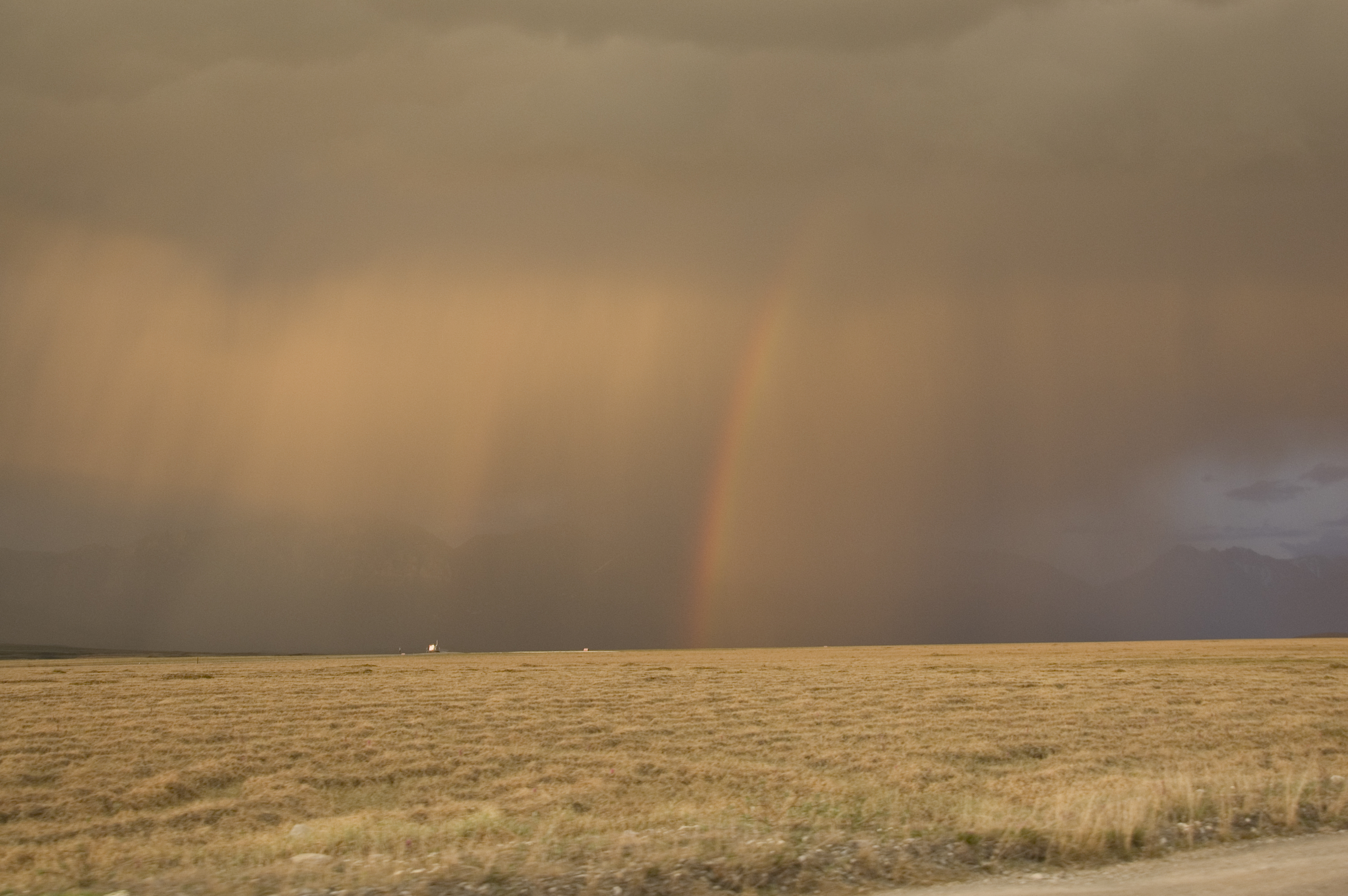 A isolated rain shower (with rainbow) glows in the midnight sun. At Galbraith Lake on the north side of Atigun Pass on the Dalton Highway in the Brooks Range, Alaska.