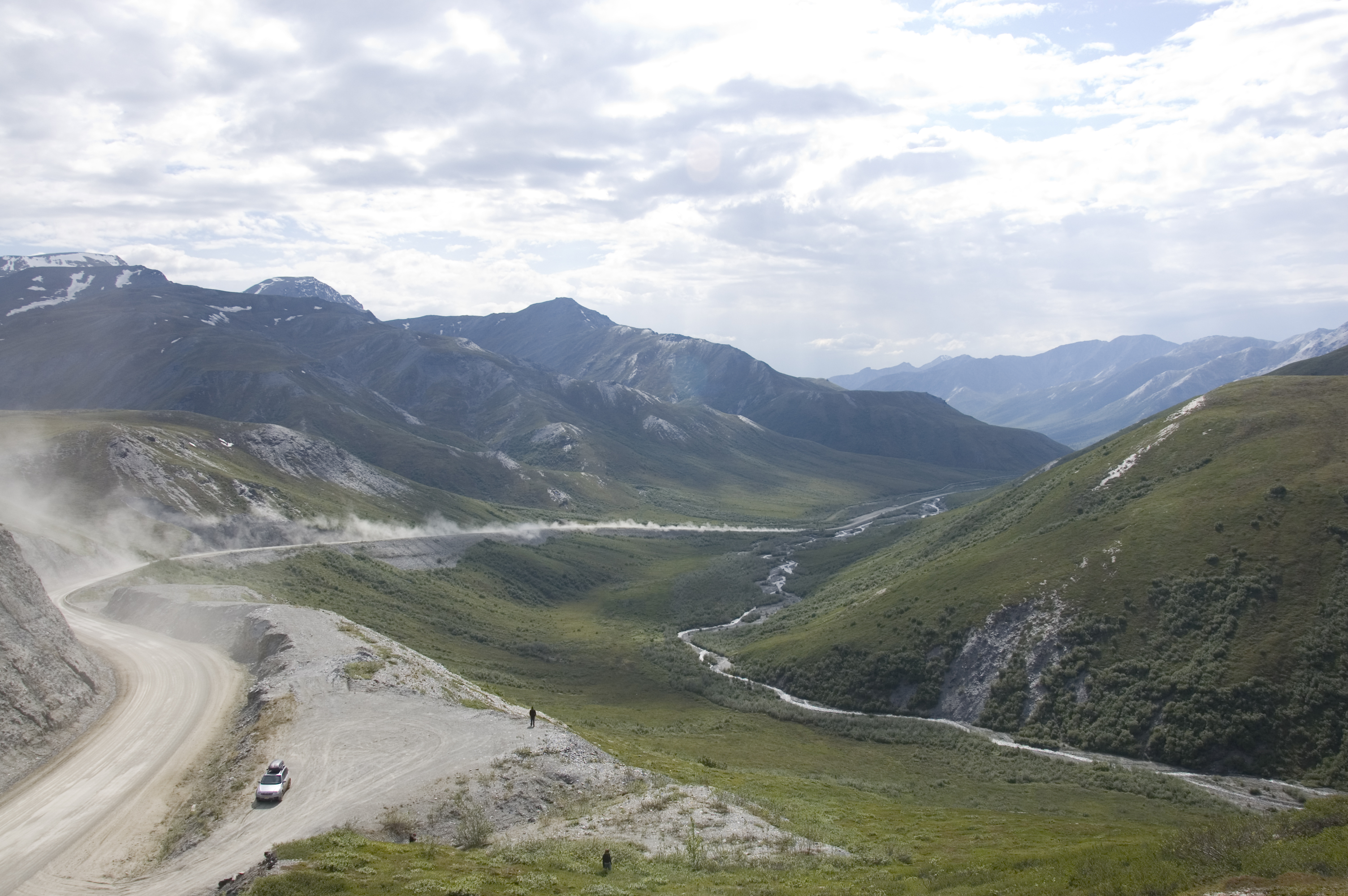 A semi truck kicks up dust in Atigun Pass. On the south side of Atigun Pass, looking south. On the Dalton Highway in the Brooks Range, Alaska.