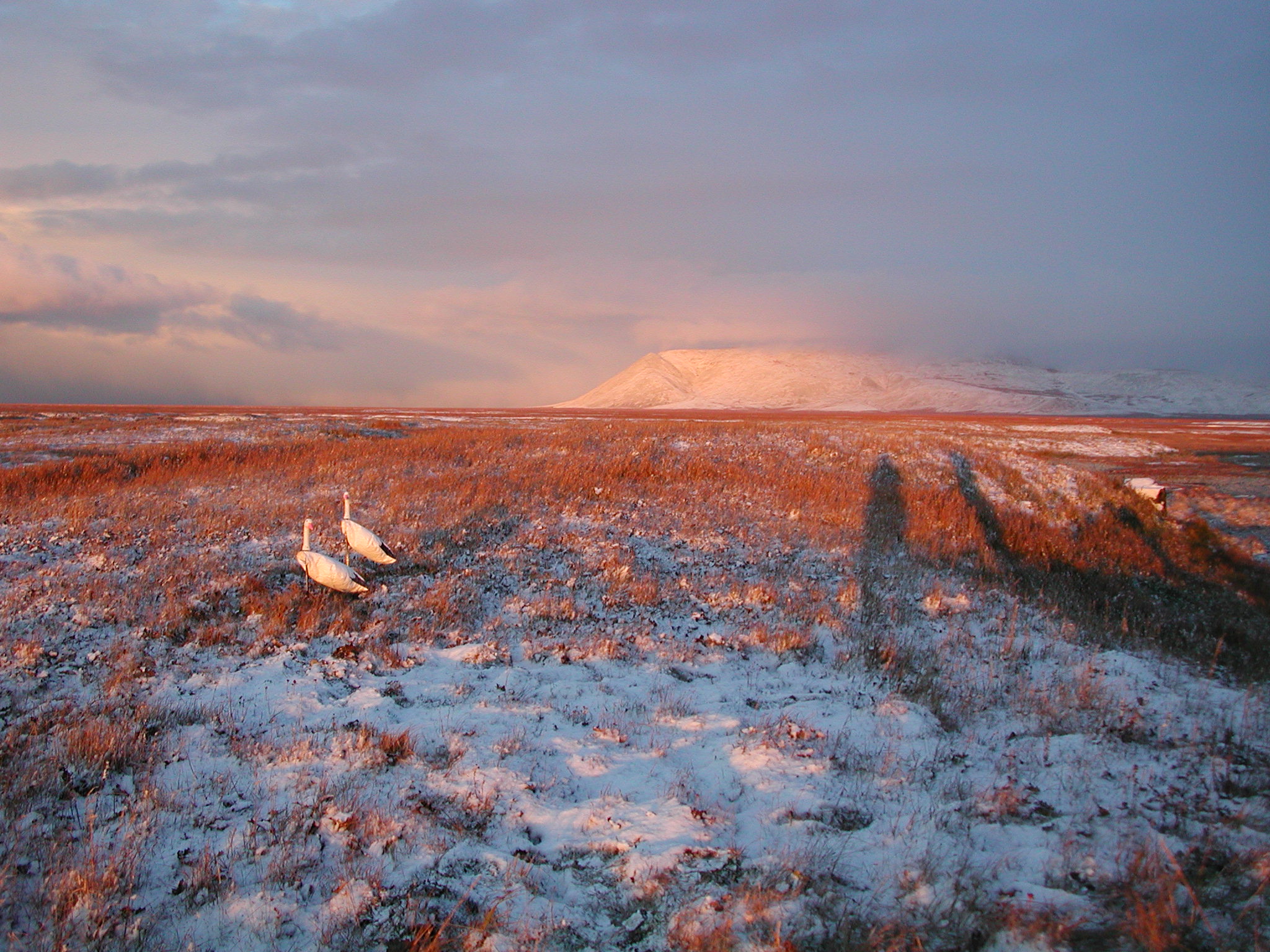 Hunting for kaangu (snow geese) in fall time using decoys. Apavaghu, St. Lawrence Island, Alaska.