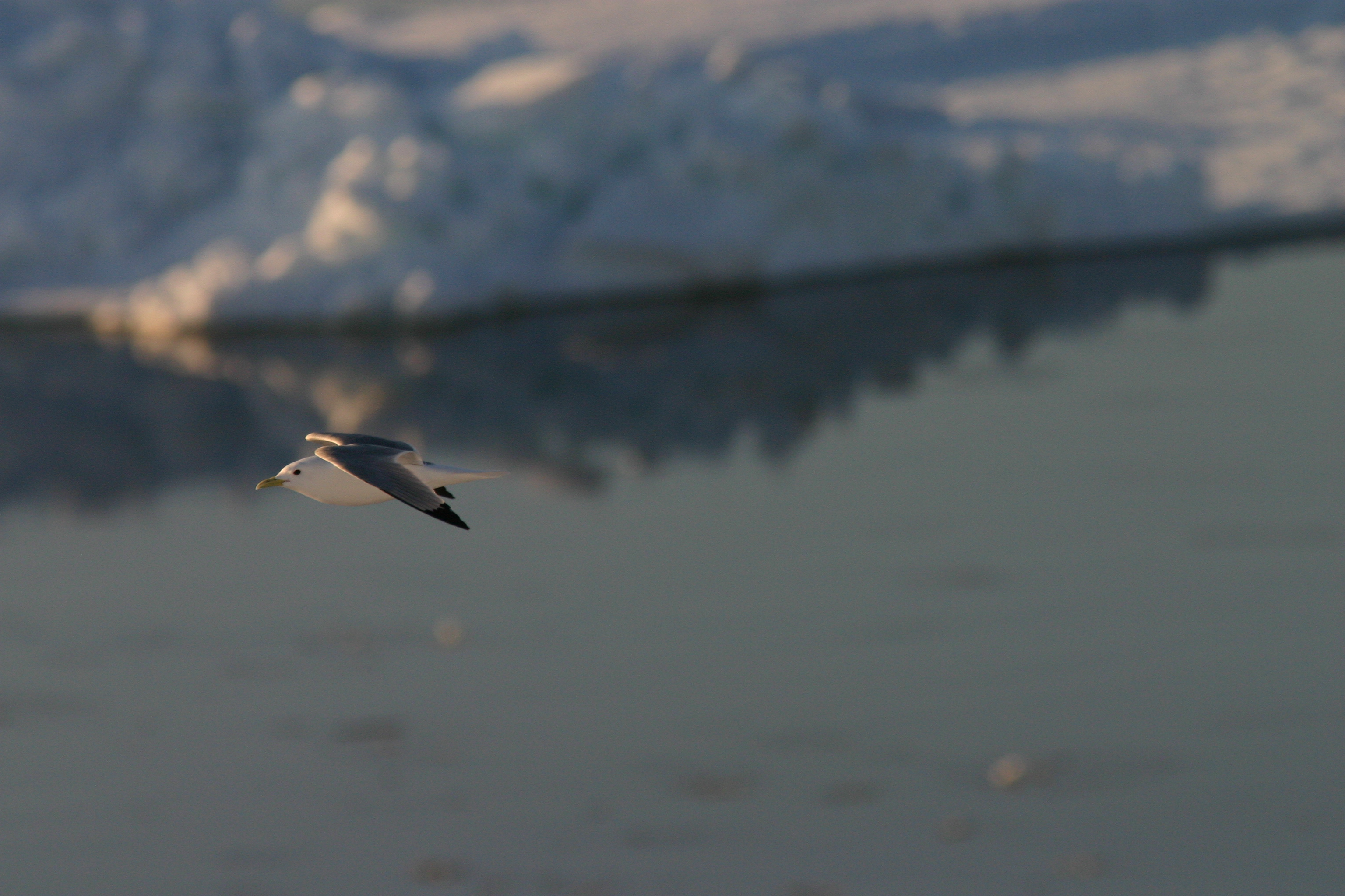 A Qaqsungiq (black-legged kittiwake) flying near the shore in Savoonga, St. Lawrence Island, Alaska.