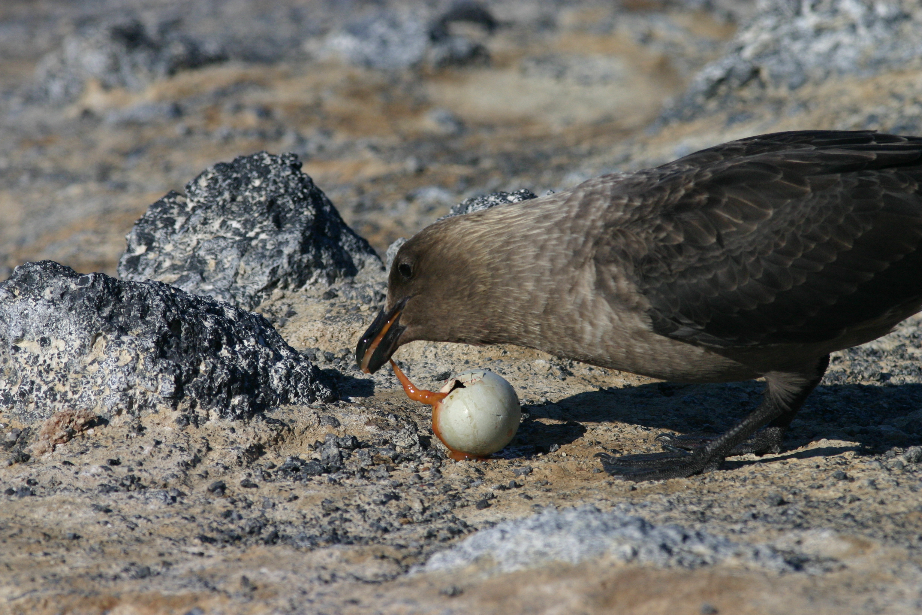 A south polar skua eats an Adélie penguin egg. Cape Royds, Ross Island, Antarctica.