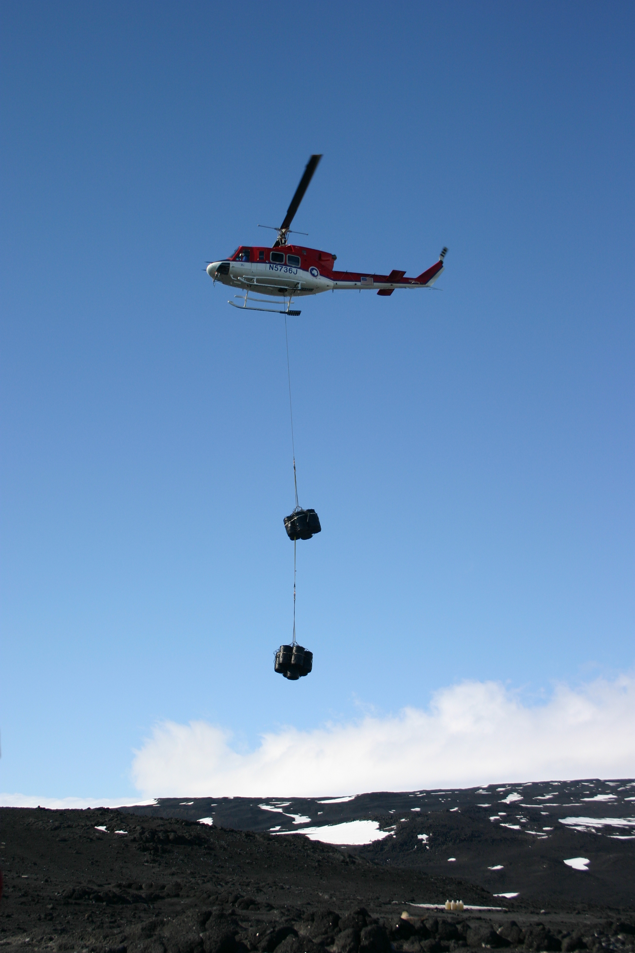 A helicopter with a double sling-load of barrels. Lisa Sheffield Guy: "All the scientists in the field are required to transfer their urine and feces into barrels to be hauled from the field sites to McMurdo, and then on to Christchurch via plane. Makes you not want to stand under one of these helicopters, huh?" Cape Royds, Ross Island, Antarctica.