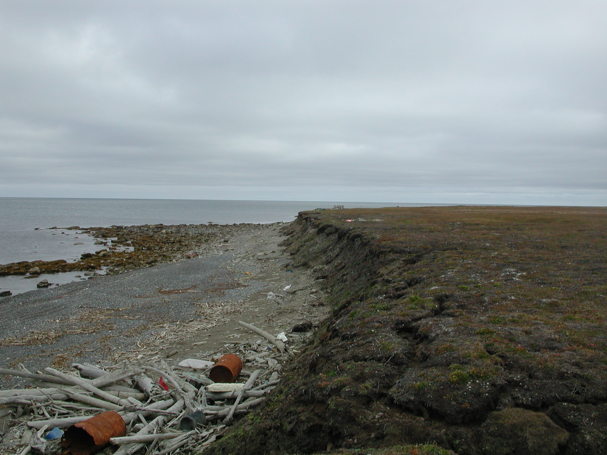 Eroding coastline and beach debris. Lisa Sheffield Guy: "There is still a lot of garbage left behind from the old base at Northeast Cape, plus lots of garbage that washed onshore from Russia and Asia." Northeastern St. Lawrence Island, Alaska.
