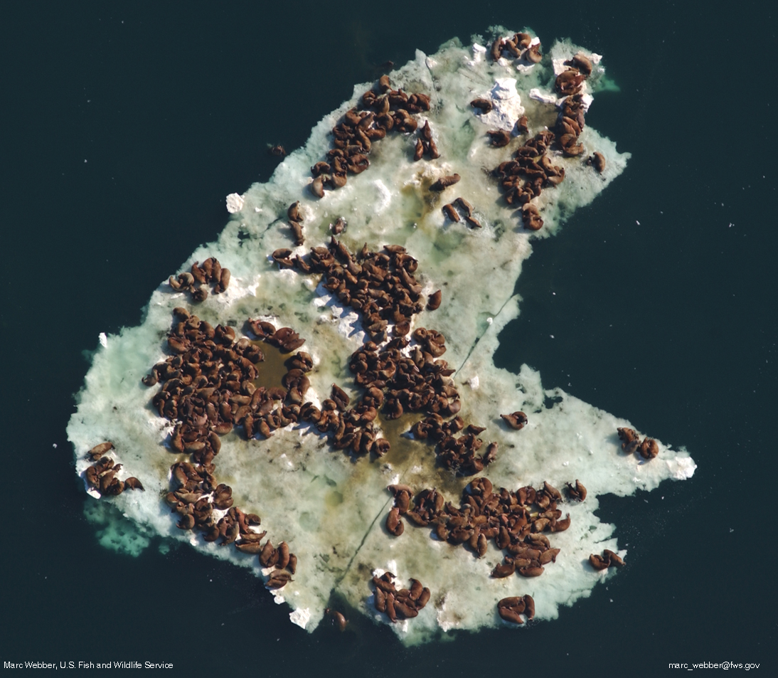 Walrus herd on floating ice.