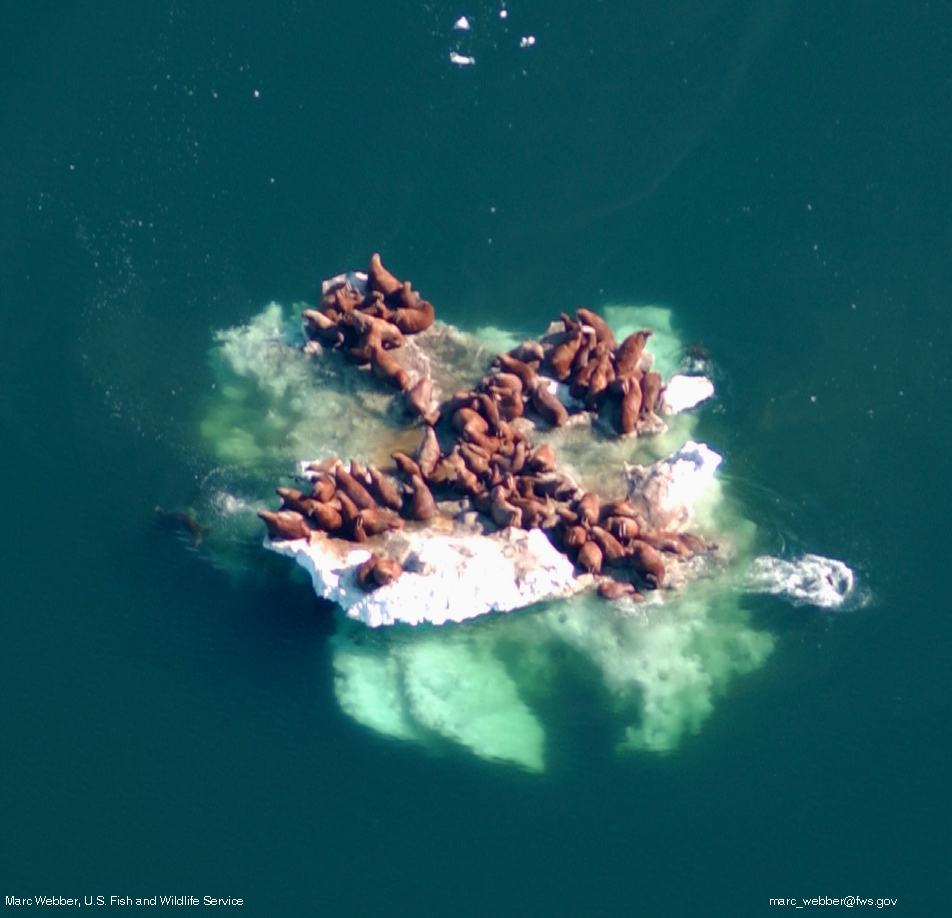 Walrus herd on floating ice.