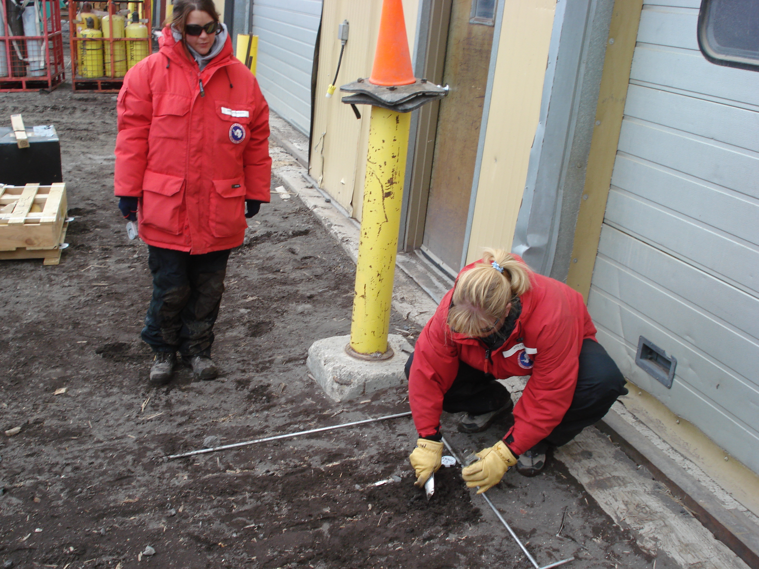 Ann Linsley taking soil samples at the heavy machinery garage area. McMurdo Station, Antarctica.