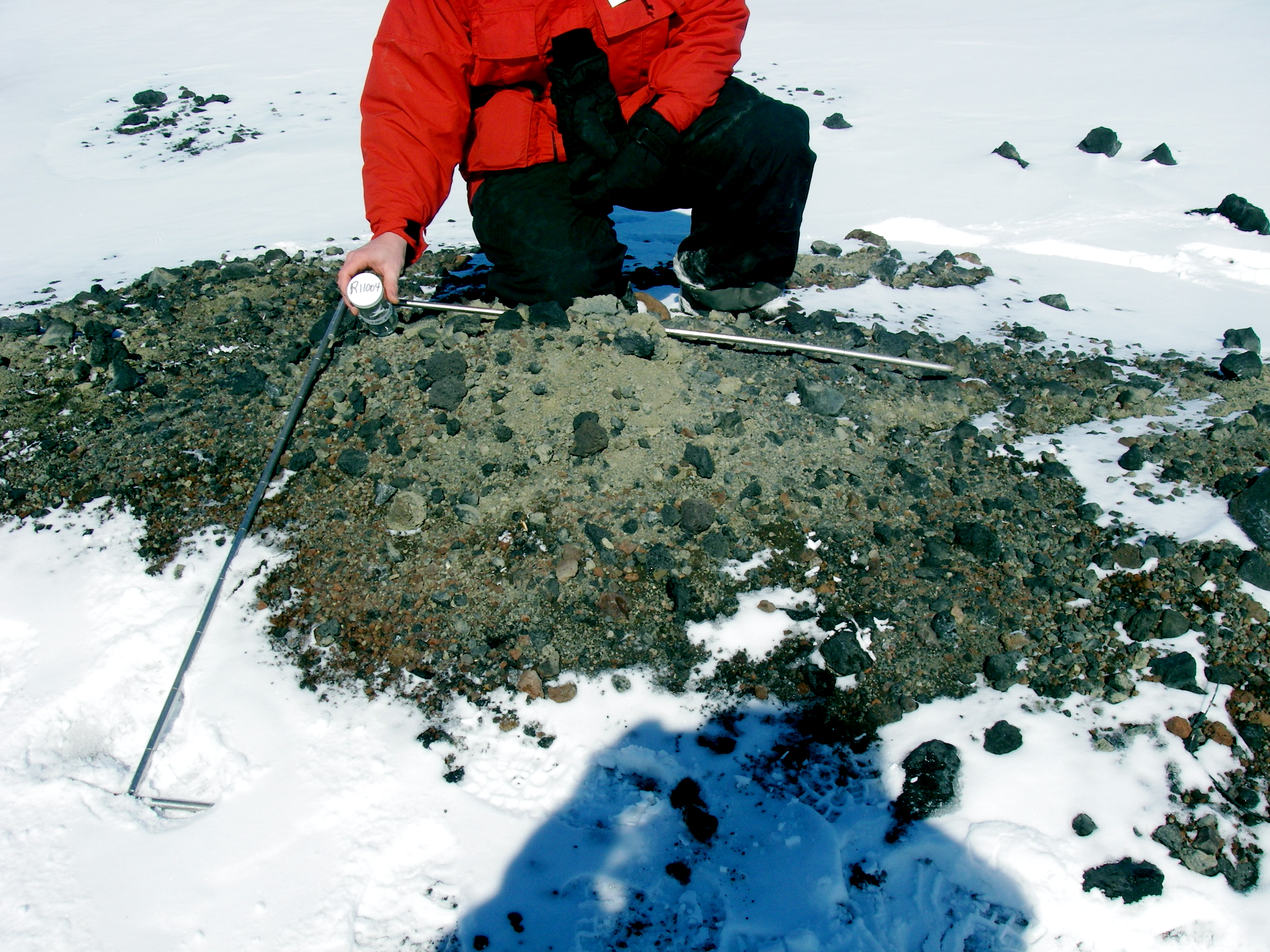 Collecting sediments and measuring slope in a sample 1 sq. meter area. Cape Armitage, Ross Island, Antarctica.