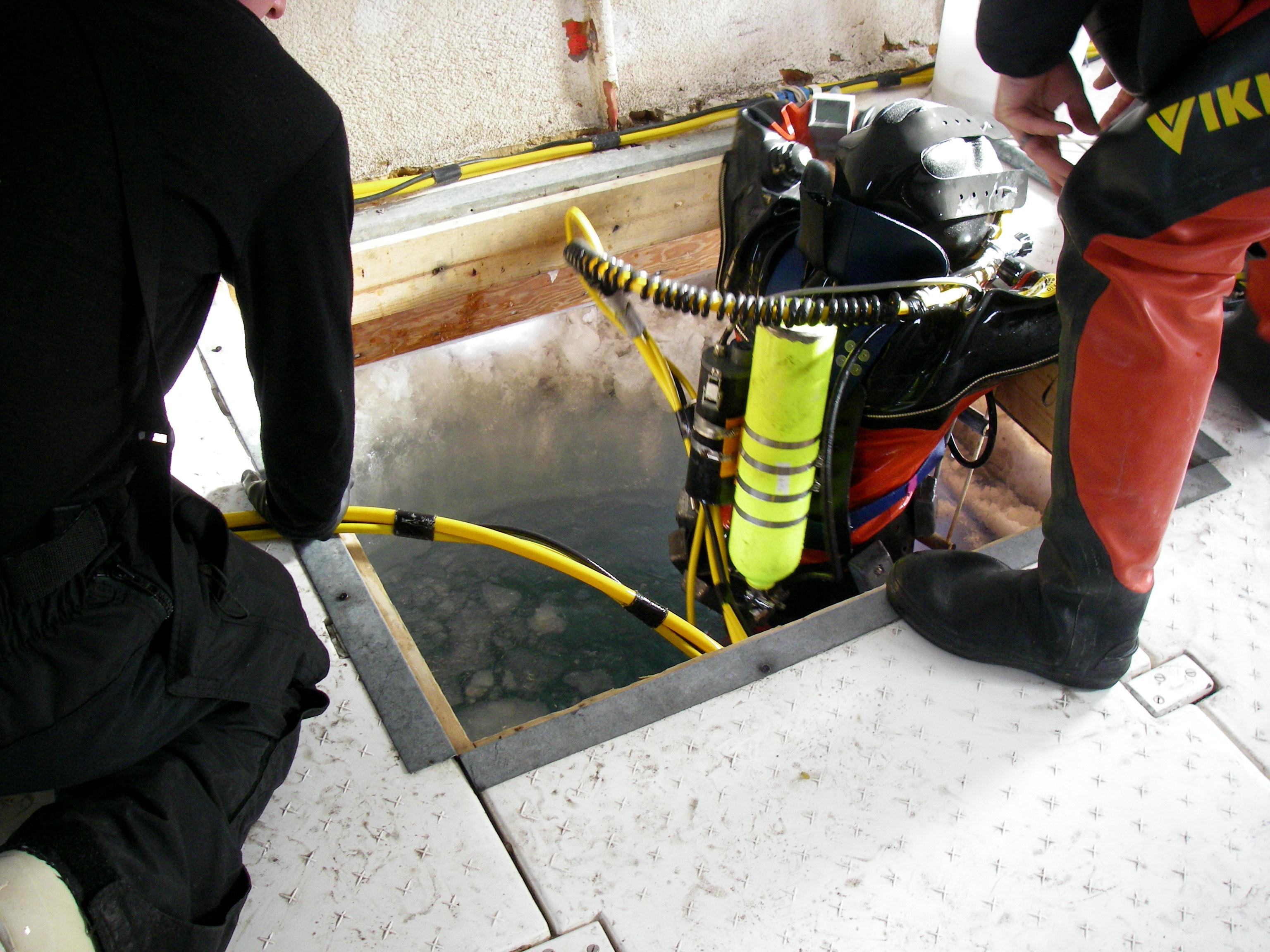 Addie, one of the divers, comes up from the dive hole into the dive hut after collecting a sediment core and sea life for the team to analyze. Harbor of McMurdo Sound, McMurdo Station, Antarctica.